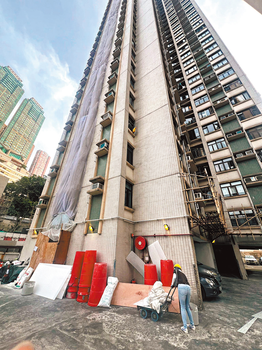 (香港文匯報記者 廣濟)大埔宏福苑的滔天大火,棚架保護網的阻燃性能成為關注點,香港特區行政長官李家超昨日宣布即時巡查所有正進行大型維修的屋苑工程。香港文匯報翻查資料顯示,涉事的承建商宏業建築工程有限公司正在炮台山、屯門等地進行多個維修工程。記者昨日到該承建商承接的炮台山道富嘉閣維修工程現場直擊,在大廈四面光井發現已搭滿竹棚架及包圍灰白色棚網,以及有發泡膠圍封,其間一名女工將大量棚網及中空板推往垃圾斗棄置。記者在垃圾斗取走棚網、中空板樣本,進行燃燒測試,發現物料瞬間烈焰竄升、火星濺落,疑似未有塗上阻燃膜,消防隱患存疑。