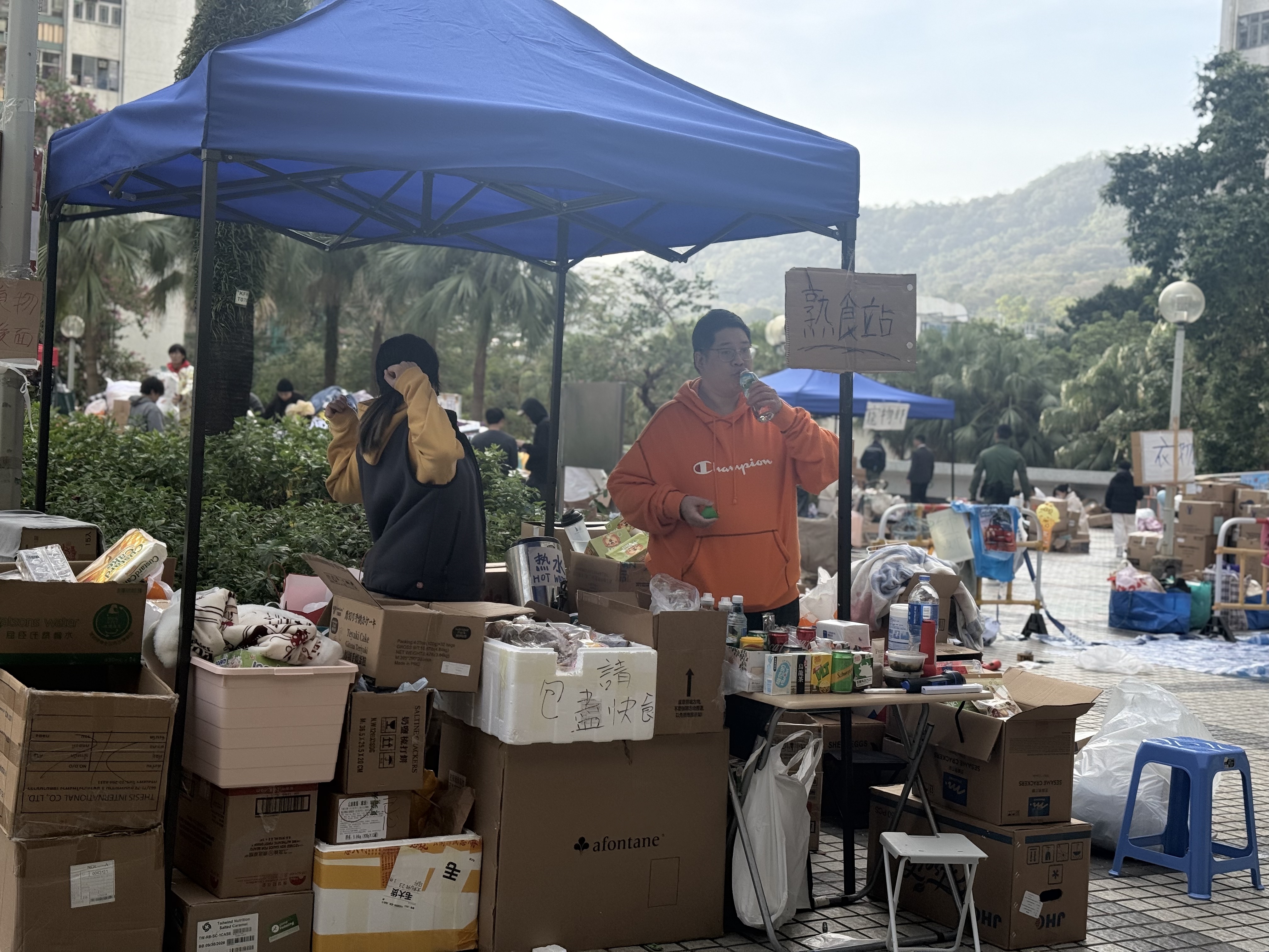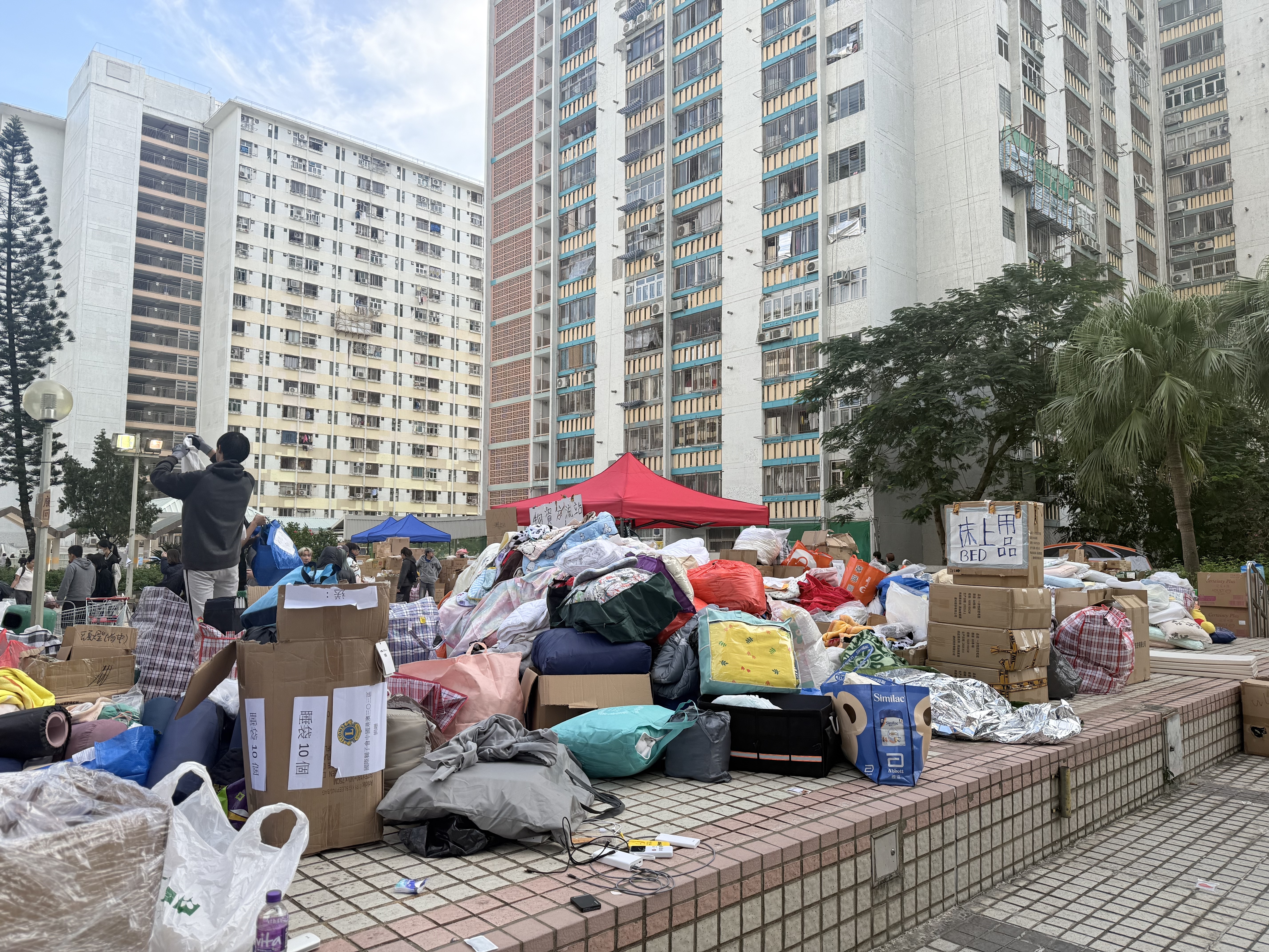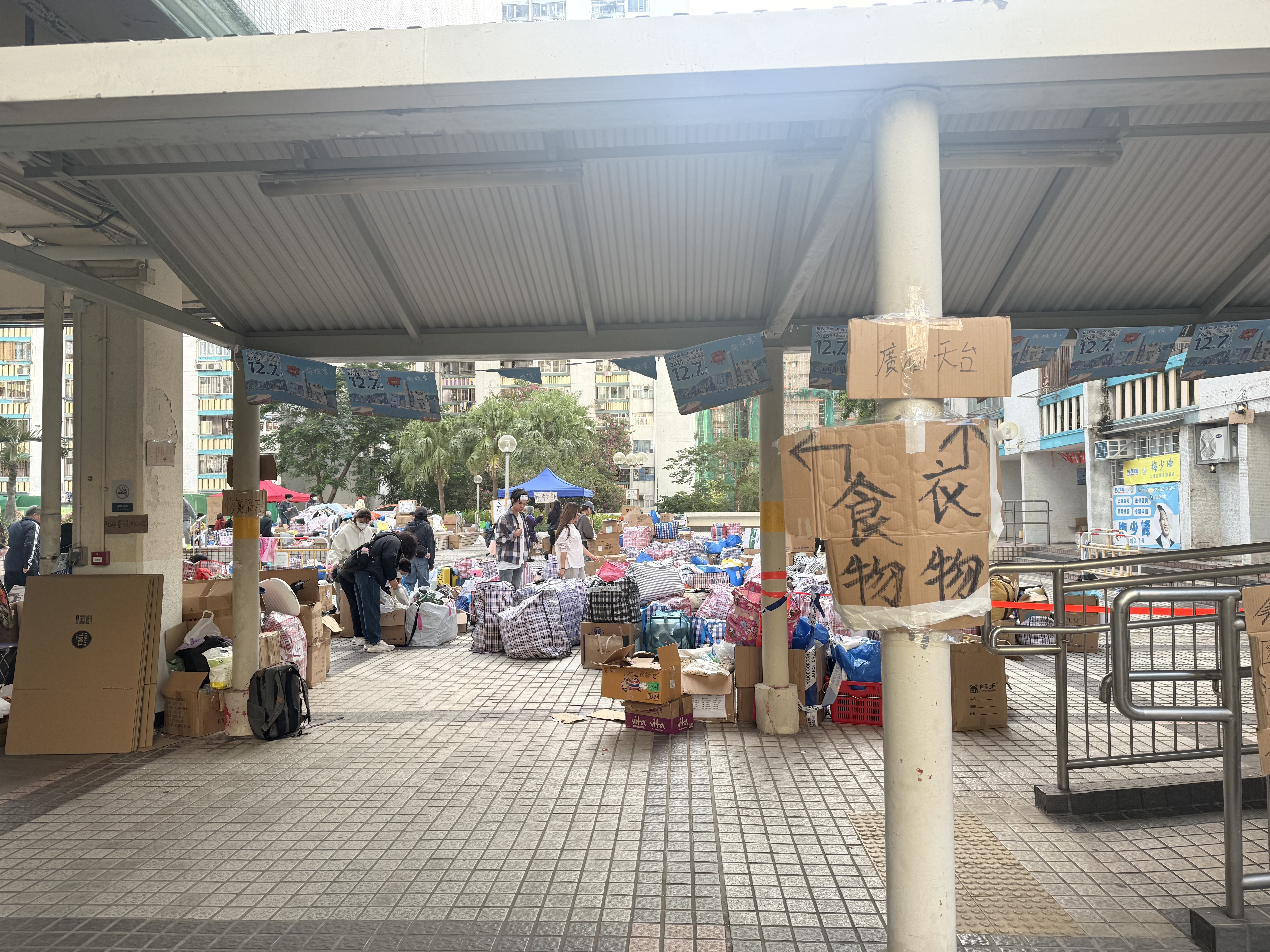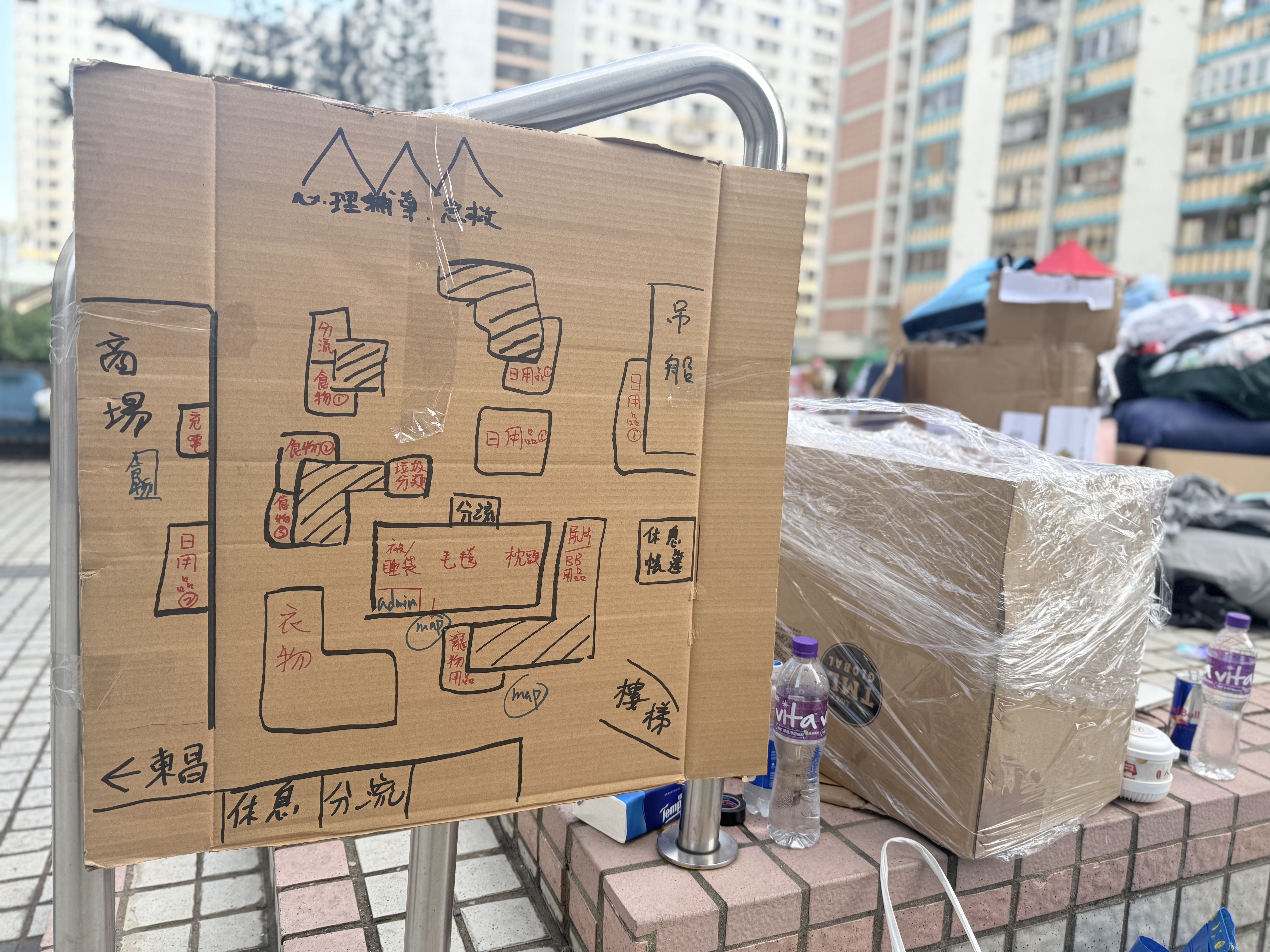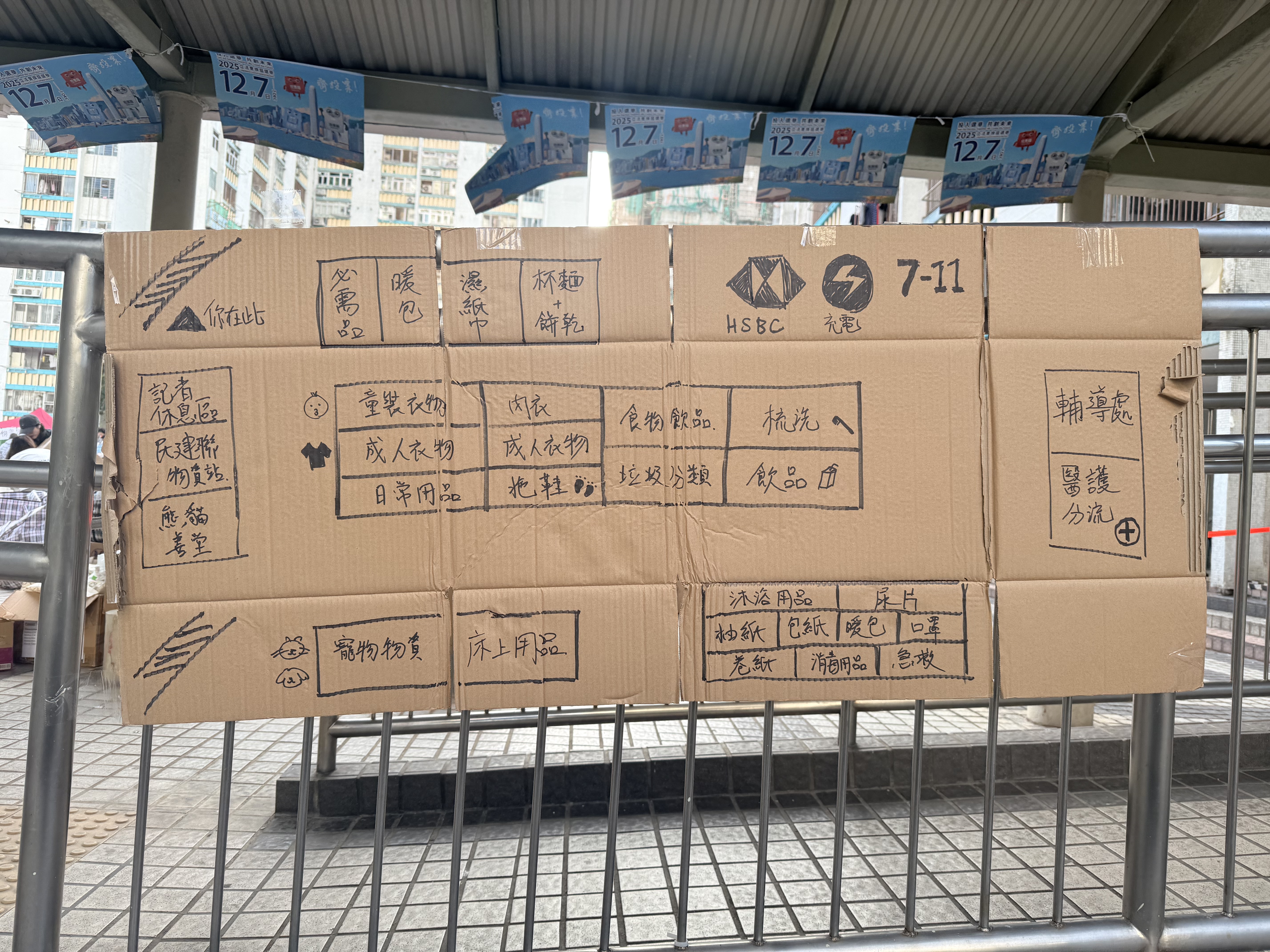 另外,今早8時許,廣福天台已有義工陸續到場為街坊派發物資,除常見的衣物與食物外,今日亦見到有寵物部,提供狗糧、貓糧及寵物零食等用品。現場亦貼有市民自行繪製的紙板指示牌,標明各類物資的分配區、記者休息室、充電區等位置。