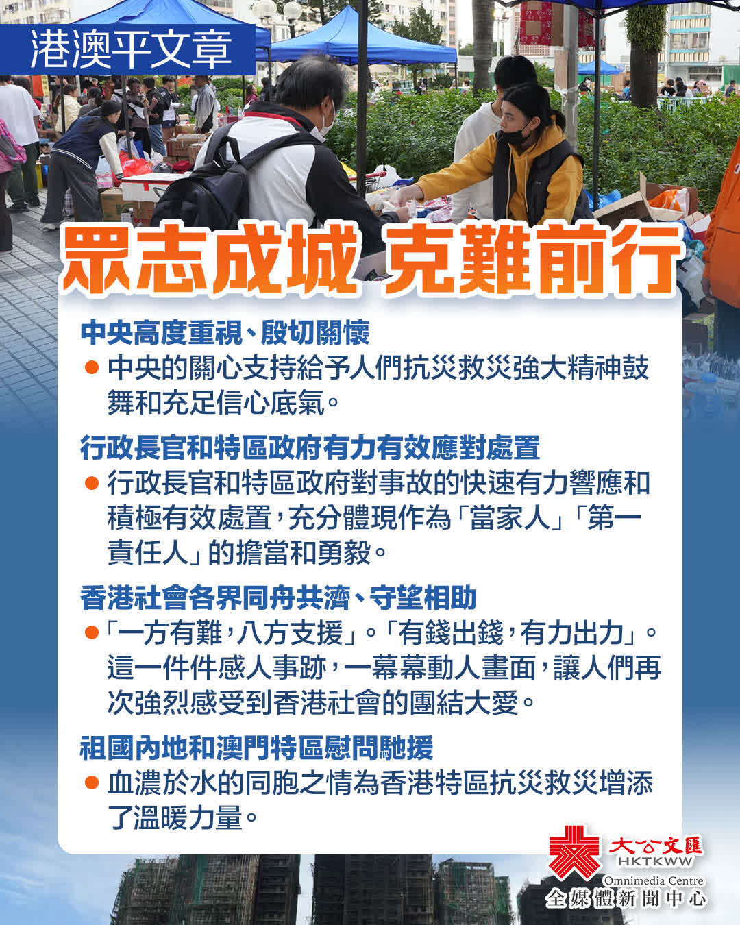 11月26日下午,香港新界大埔屋邨宏福苑多棟住宅樓發生火災,造成重大人員傷亡。面對這場突如其來的災難,從中央到特區,從政府到民間,從香港到內地,迅速匯聚抗災救災磅礴力量,充分展現人間有情、團結大愛。