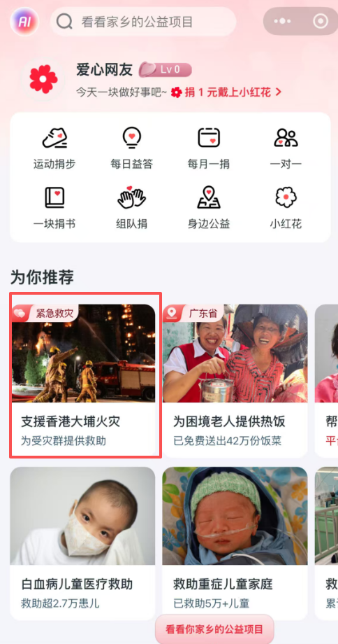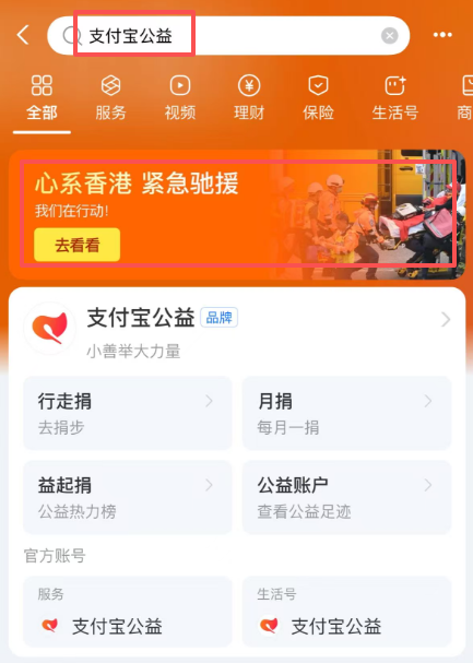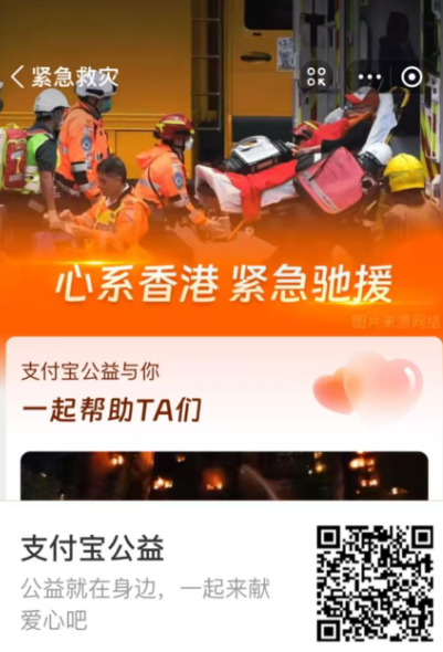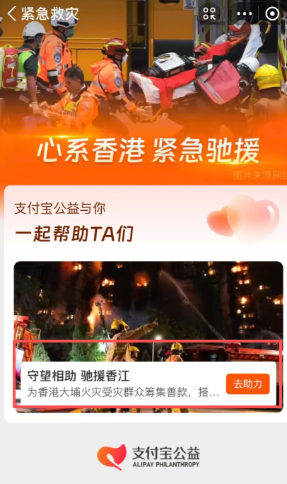 AlipayHK首頁開設專項捐助通道,方便香港市民參與慈善機構的相關救援項目。