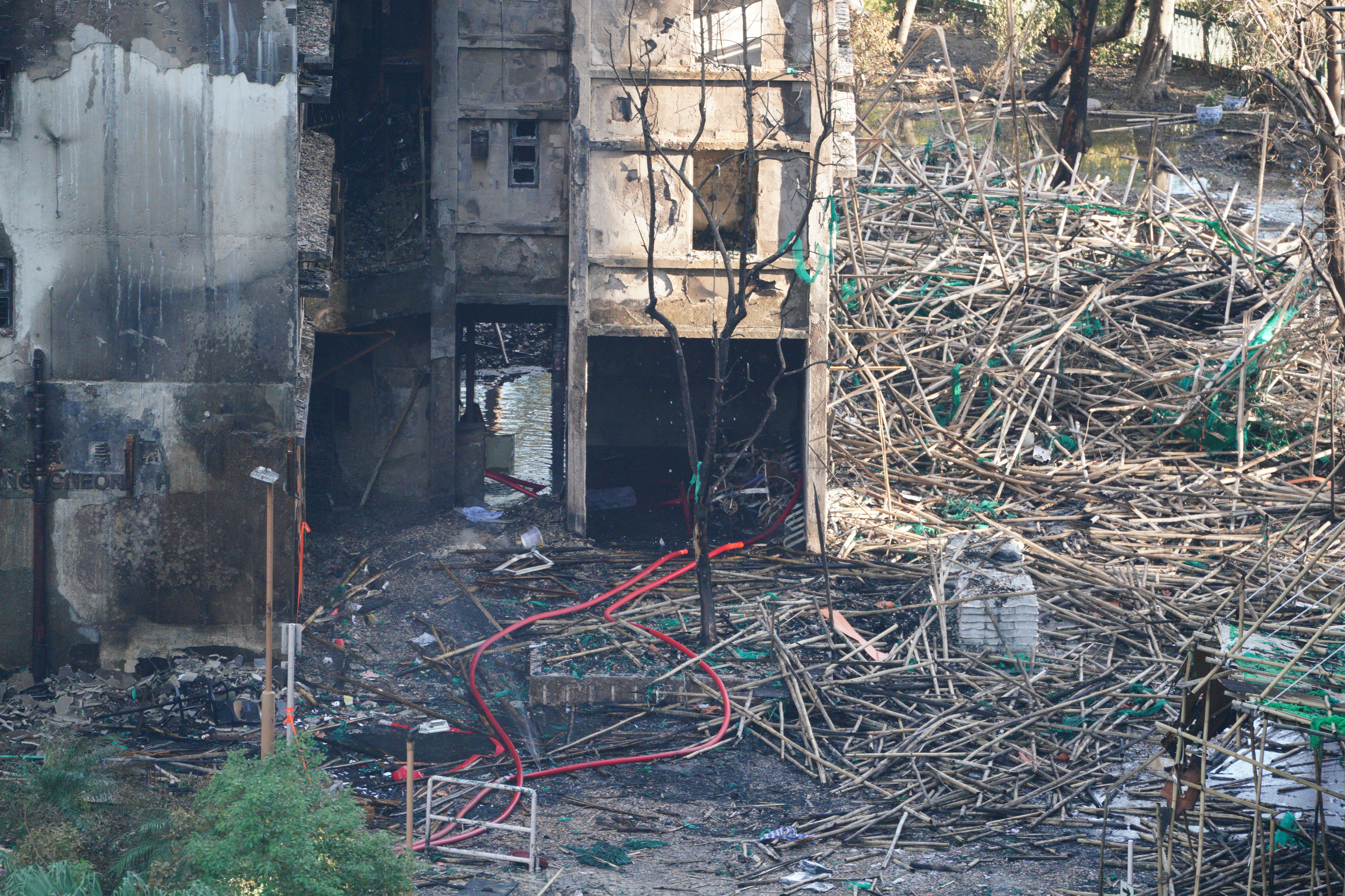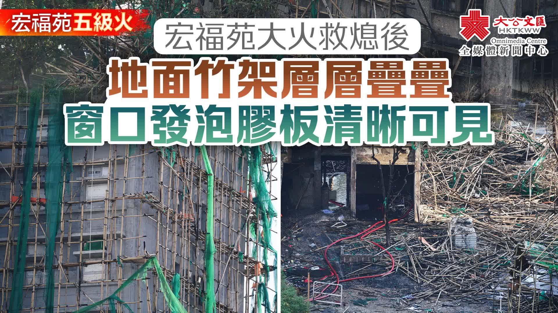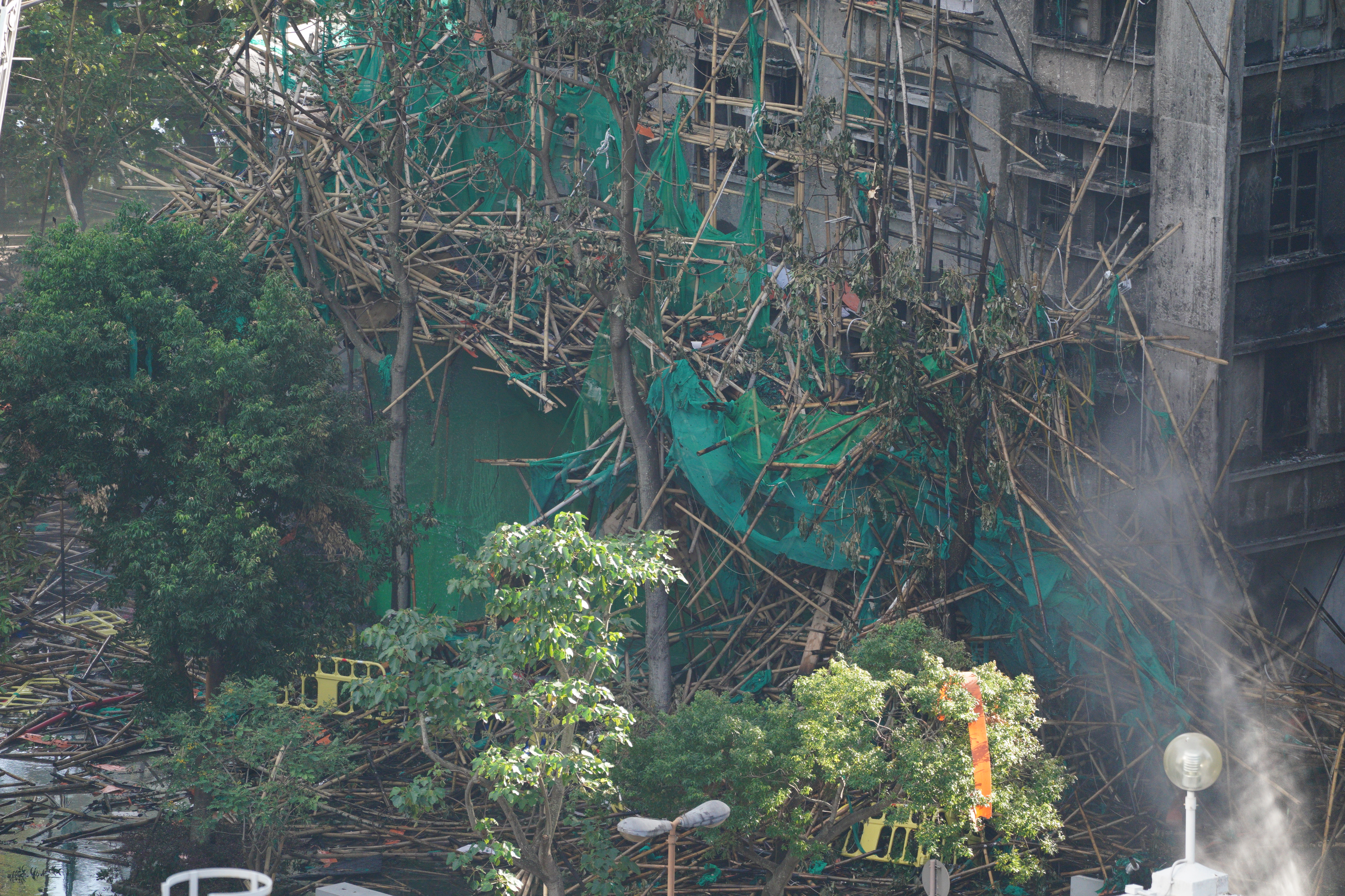現場可見,有大廈樓下堆積層層疊疊棚架,亦有棚架在墜落過程中被棚網兜住,懸置半空。保安局局長鄧炳強下午表示,火災時高層的棚架不斷跌落,堵塞了大廈的出入口及緊急車輛的車口,也都嚴重阻礙了消防同事進入樓宇救援。