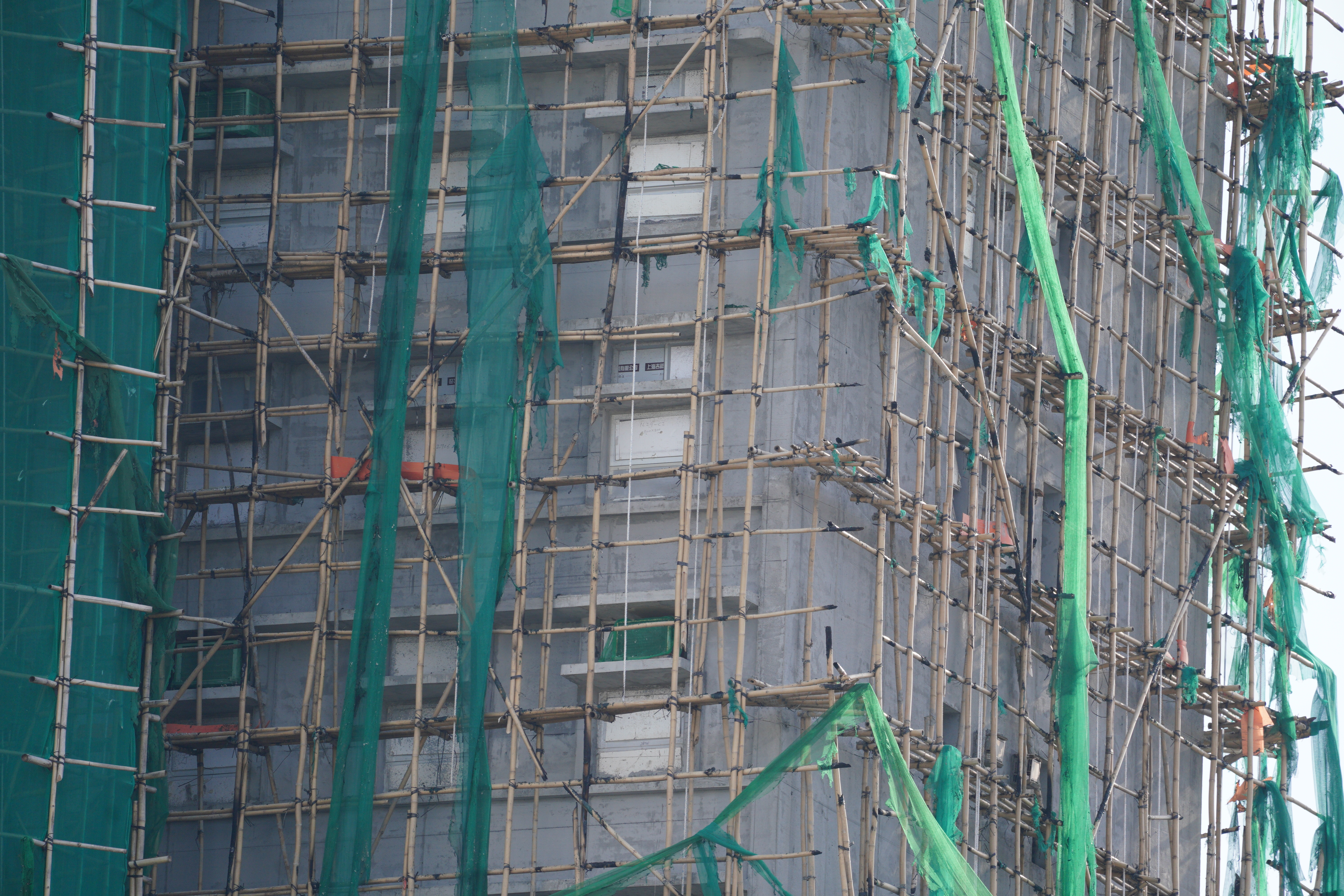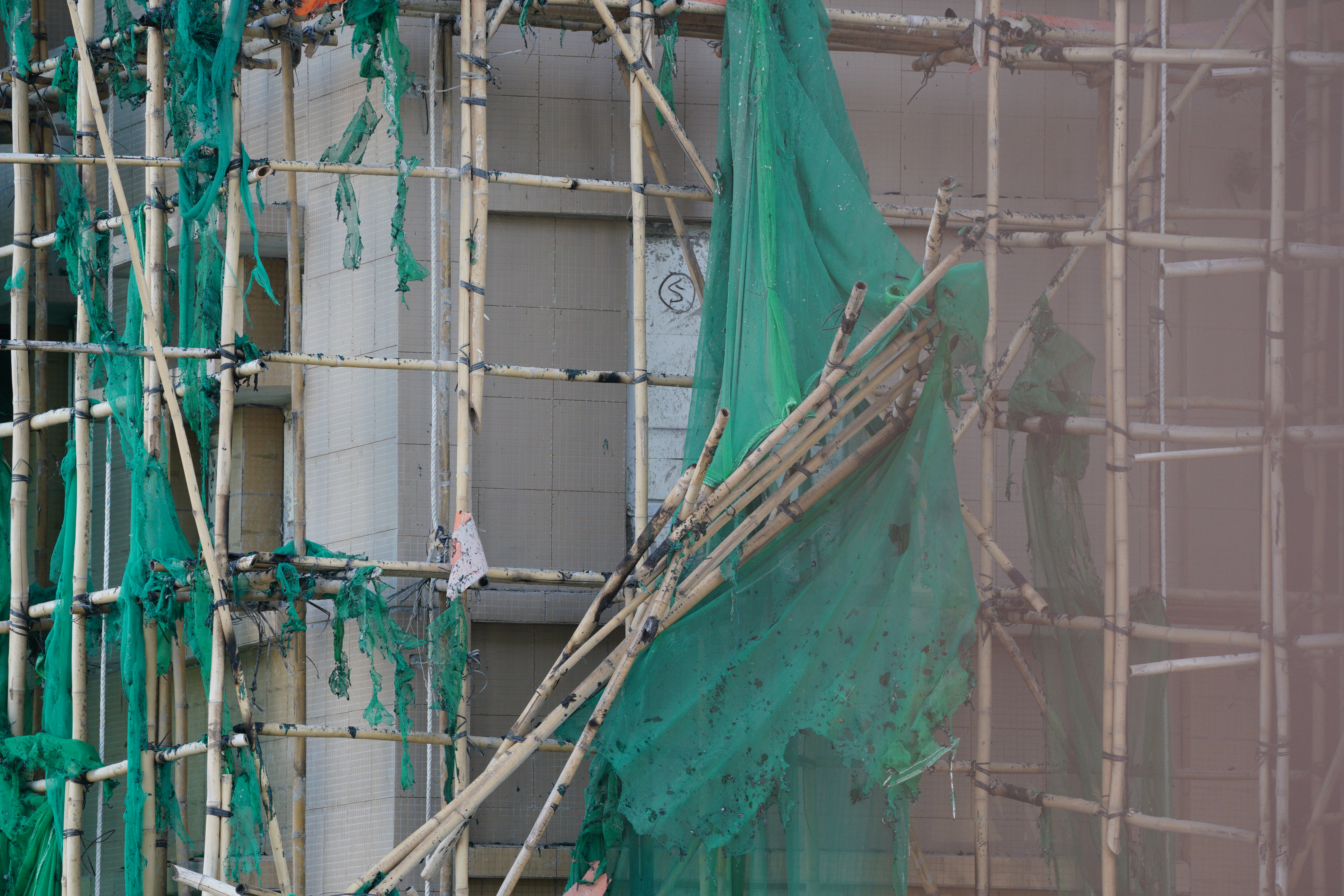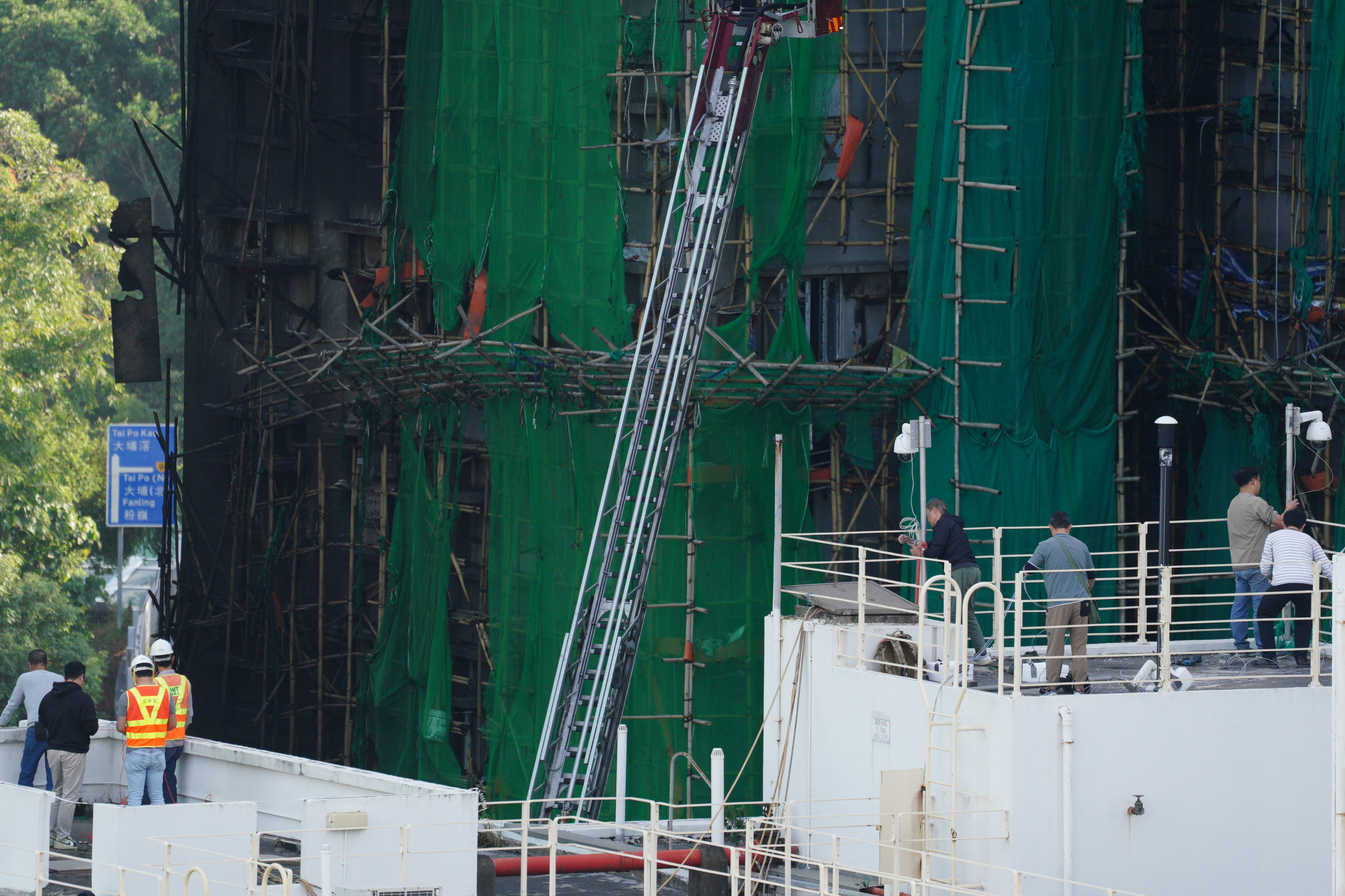 現場可見,有大廈樓下堆積層層疊疊棚架,亦有棚架在墜落過程中被棚網兜住,懸置半空。保安局局長鄧炳強下午表示,火災時高層的棚架不斷跌落,堵塞了大廈的出入口及緊急車輛的車口,也都嚴重阻礙了消防同事進入樓宇救援。