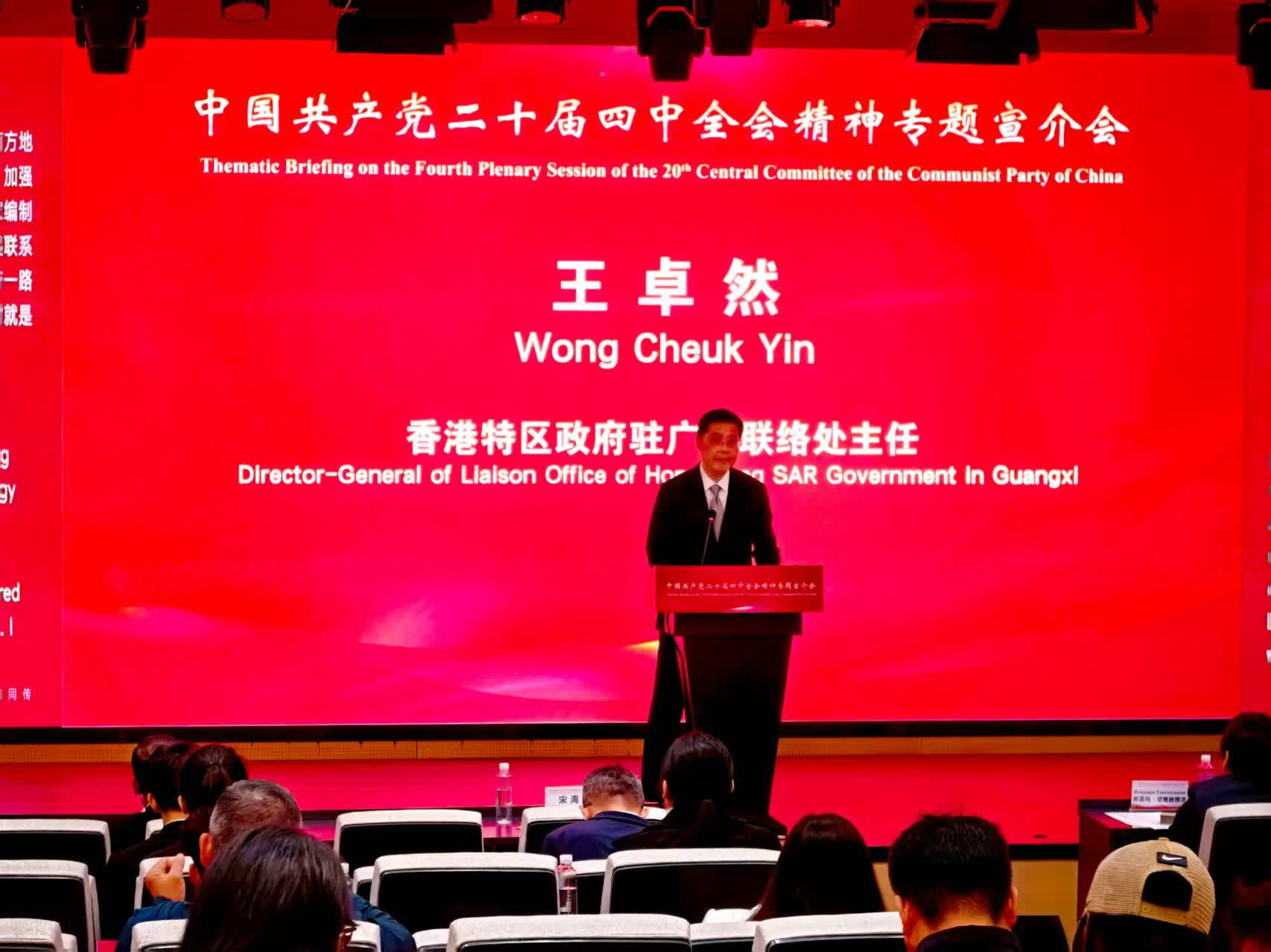 香港特別行政區政府駐廣西聯絡處主任王卓然,在發言中結合四中全會精神,提出桂港合作在科技創新協同、「一帶一路」聯動、青年交流與人文紐帶三大機遇的建議。