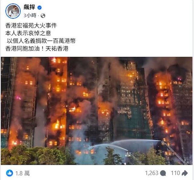 「館長」陳之漢在社交平台發文,表示「香港宏福苑大火事件,本人表示哀悼之意,以個人名義捐款100萬港幣」,並呼籲香港同胞共同努力,重建家園,「香港同胞加油!天祐香港」。