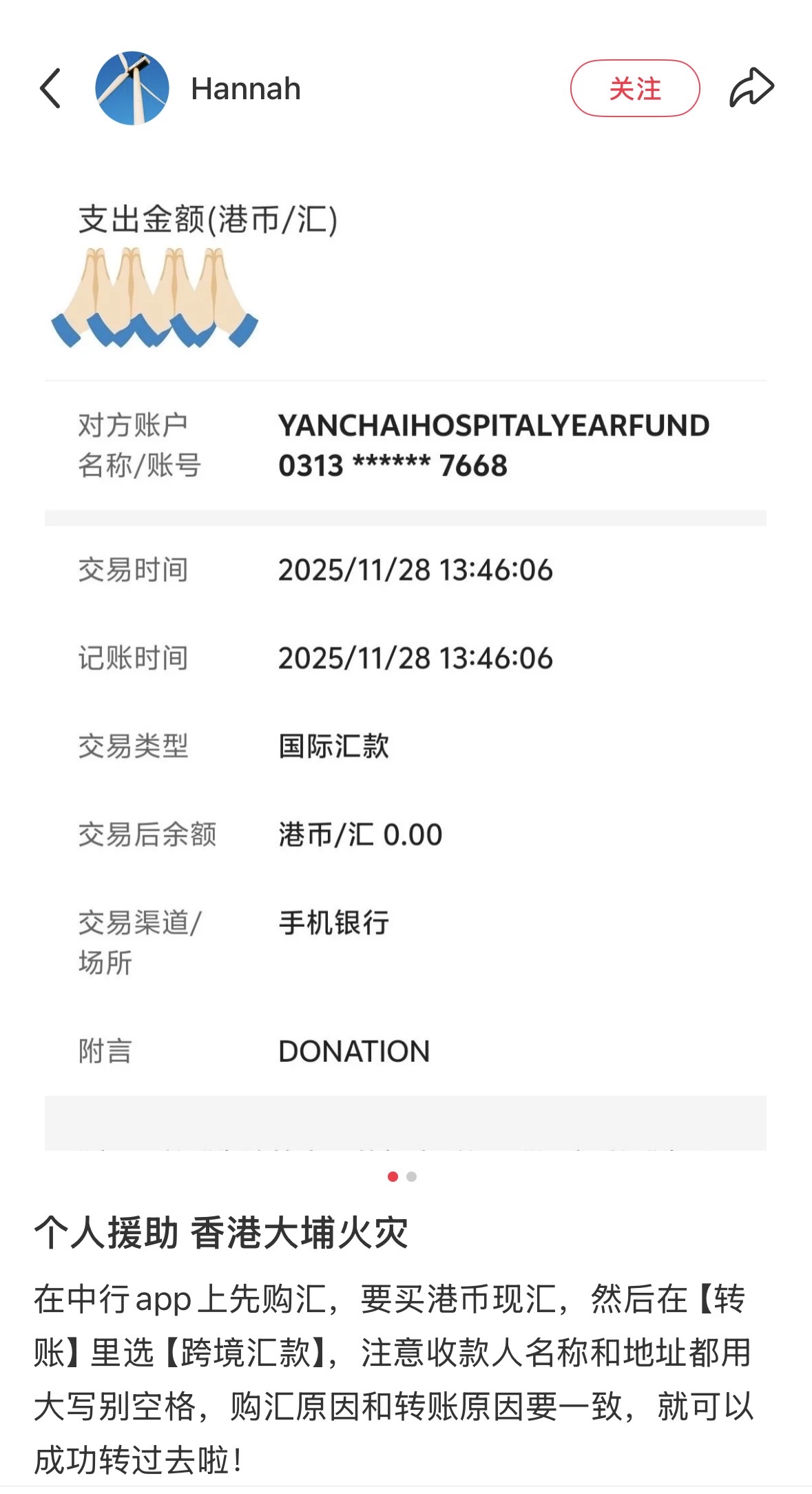 不少人貼出已成功捐款的截圖,有人甚至特意到銀行開設外幣賬戶,只為給香港送上一點點心意。有廣東網友留言:「香港發生這麼大的事,我們支持很應該的,大家是一家人。」一名四川網友的文字更顯溫情:「當年香港人幫過四川人,我們也要盡一點力量。哪怕是多幾瓶水、多幾餐飯。」