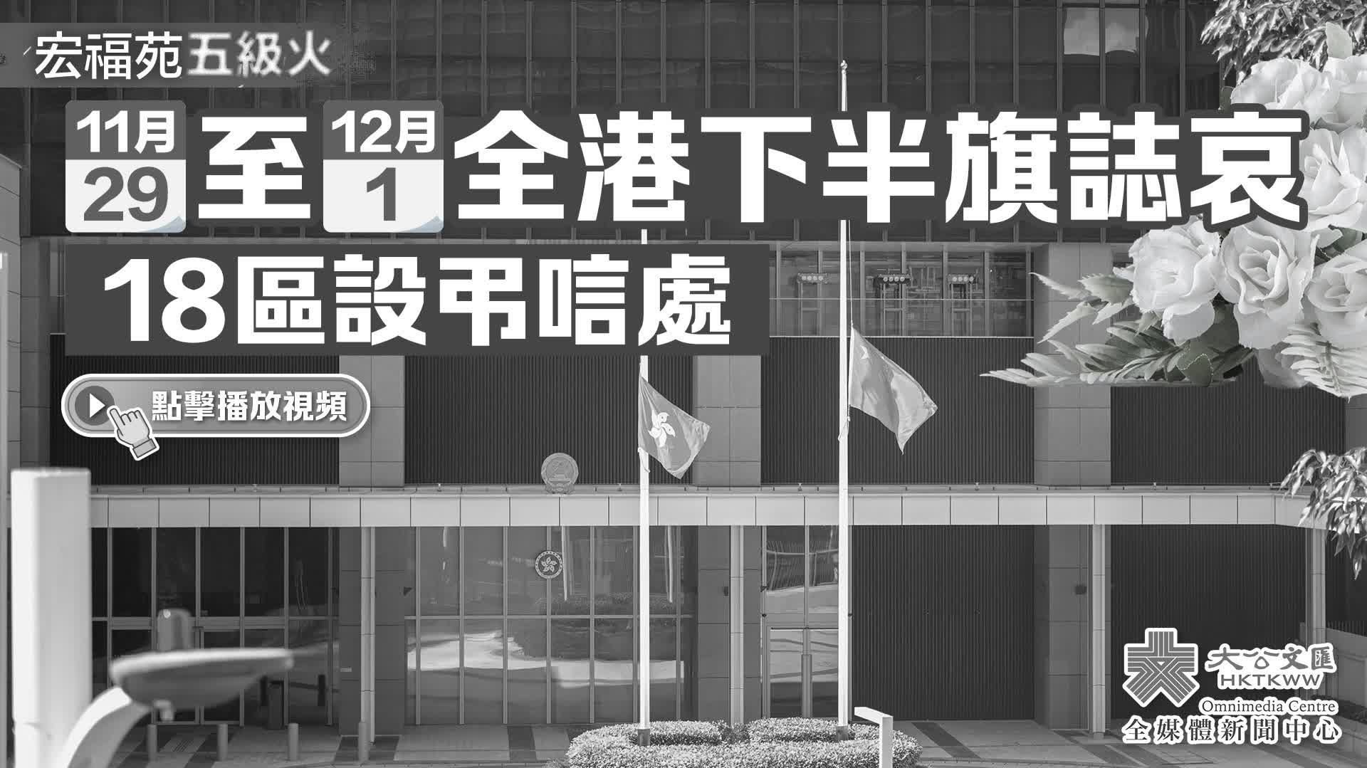 大公文匯全媒體報道,為表達對大埔宏福苑火災罹難者的沉重哀悼,特區政府將進行悼念,由11月29日至12月1日,全港所有政府建築物及設施(包括特區政府駐境外辦事處)的國旗及區旗會下半旗誌哀。其間,政府主要官員會取消非必要的公開活動。所有由政府舉辦及資助舉行的娛樂及慶祝活動亦會按情況安排取消或延期。