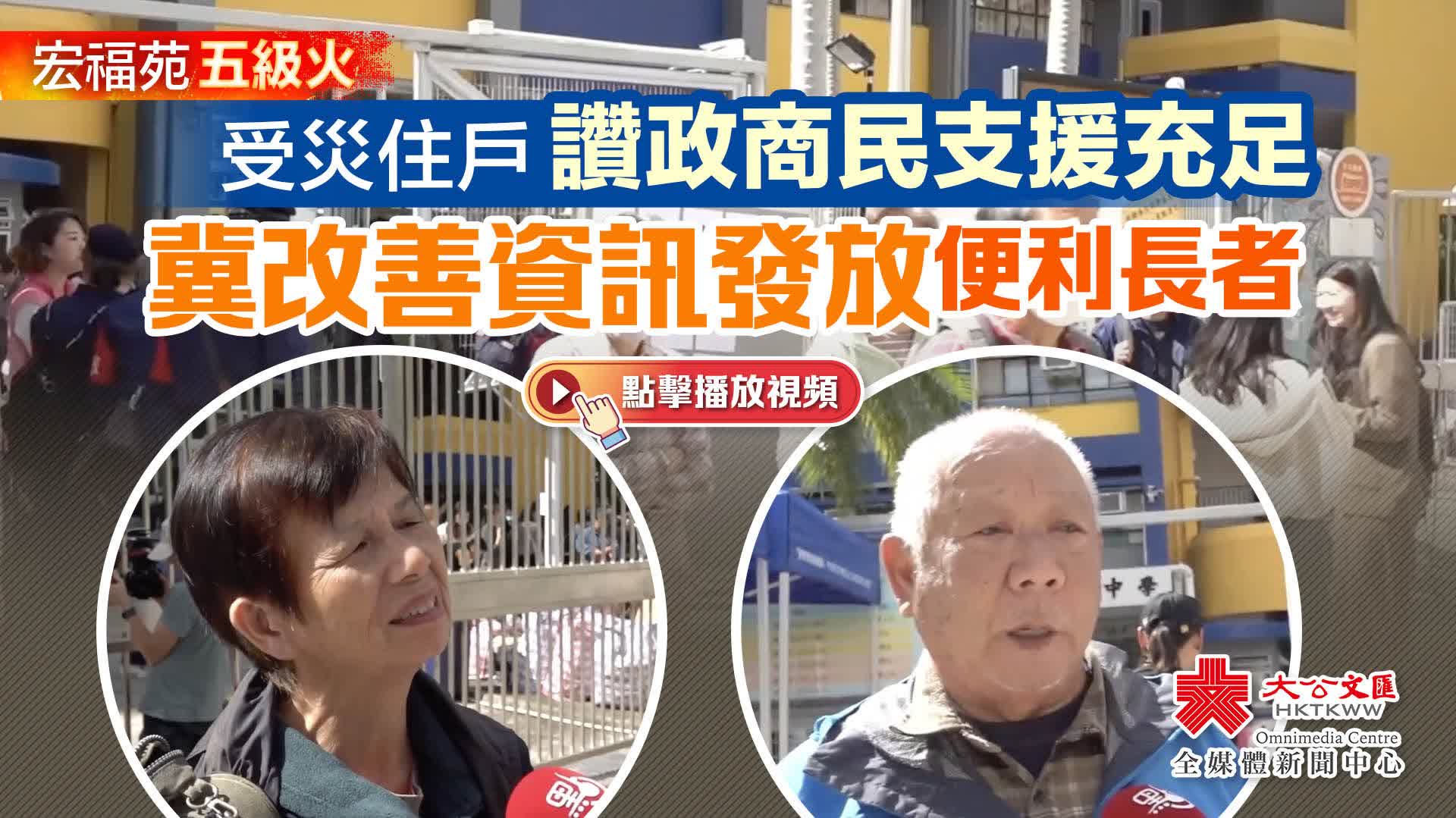 另一住戶陳女士則透露,當時火勢猛烈,所幸丈夫和自己剛好在外工作,避開一劫,現時暫在親戚家中,最大問題是擔心流離失所,期望今日順利地辦理手續,找到合適住所居住。陳女士認為,政府與社會各界有很充足的支援,感謝一眾熱心人士,但現時資訊較多,較易引人混亂,尤其宏福苑屬於老人社區,有較多長者不會用智能手機,希望能加以整理,便利市民。