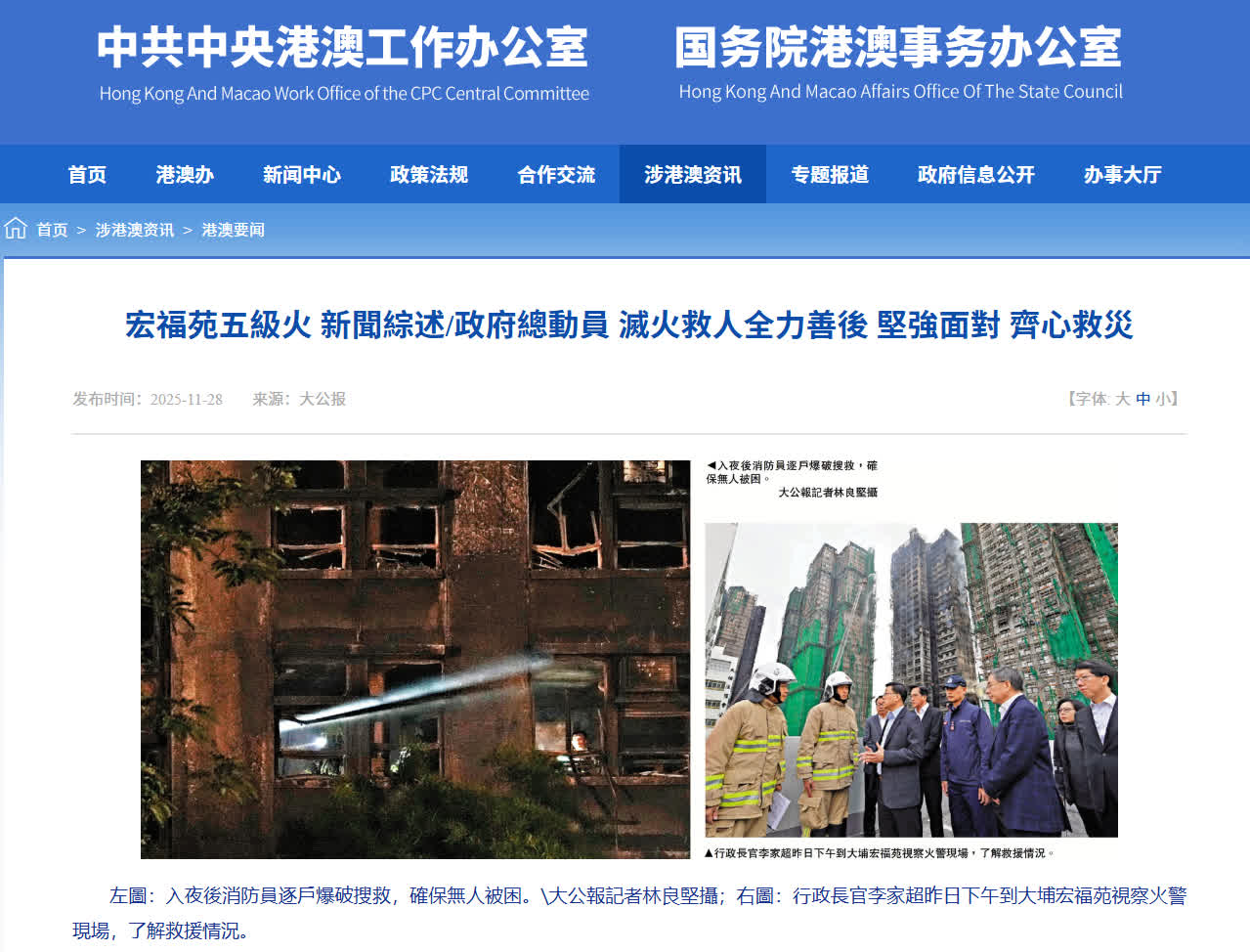 中央港澳工作辦公室、國務院港澳事務辦公室,11月28日在網站轉載《大公報》題為《政府總動員 滅火救人全力善後 堅強面對 齊心救災》的新聞綜述。文章指出,宏福苑大火發生後,中共中央總書記、國家主席、中央軍委主席習近平高度重視,中央港澳辦工作組連夜馳援,特區政府啟動緊急統籌機制,香港各界動員起來幫助受災家庭渡過難關,內地同胞也紛紛伸出援手。以下為全文: