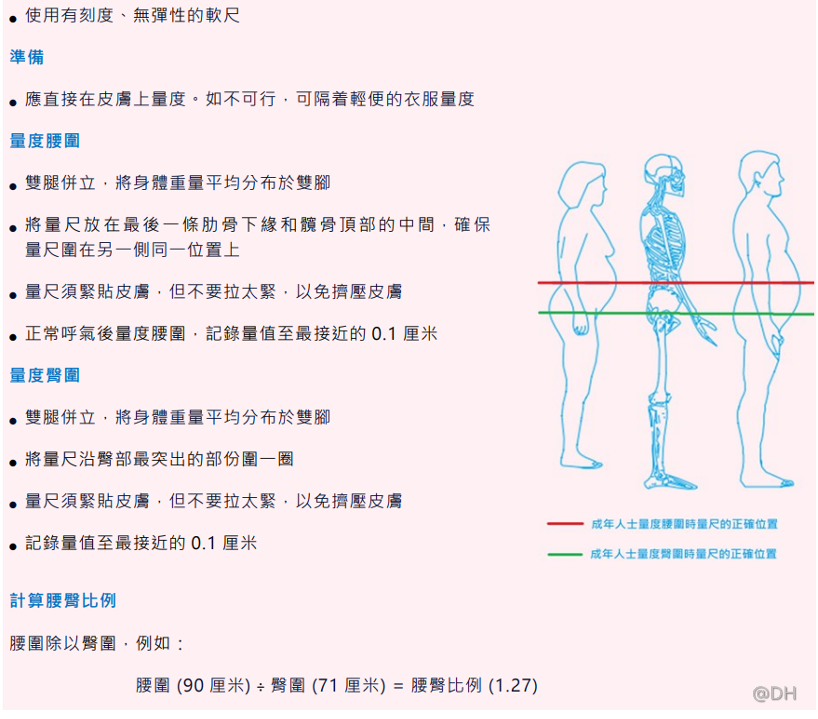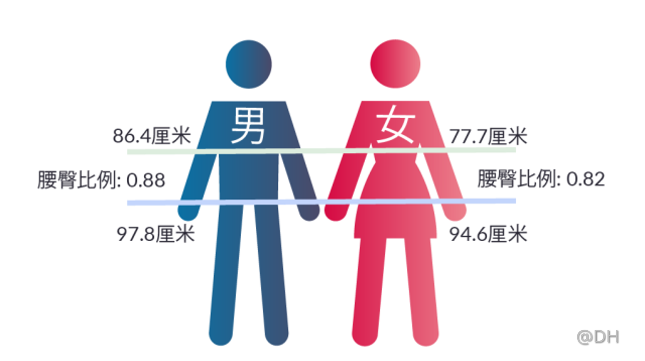 大多數亞洲(包括華裔)成人而言,中央肥胖指男性腰圍等於或大於 90 厘米,女性腰圍等於或大於 80 厘米 。男性腰臀比例達 0.90 或以上,女性腰臀比例達 0.85 或以上,亦屬中央肥胖 。一般而言,腰圍越大或腰臀比例越高,罹患慢性病的風險就越高。調查顯示,15-84歲港人平均腰圍為男性86.4厘米,女性77.7厘米;男女的平均腰臀比例分別為 0.88 和 0.82。按腰圍和腰臀比例界定為中央肥胖者分別佔 37.8% 和 35.4%。