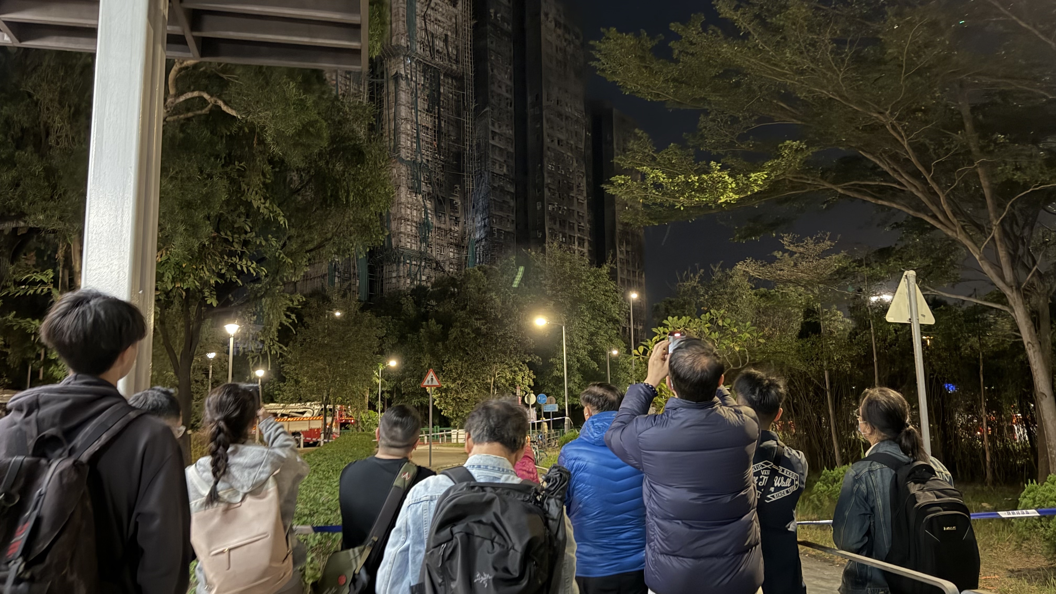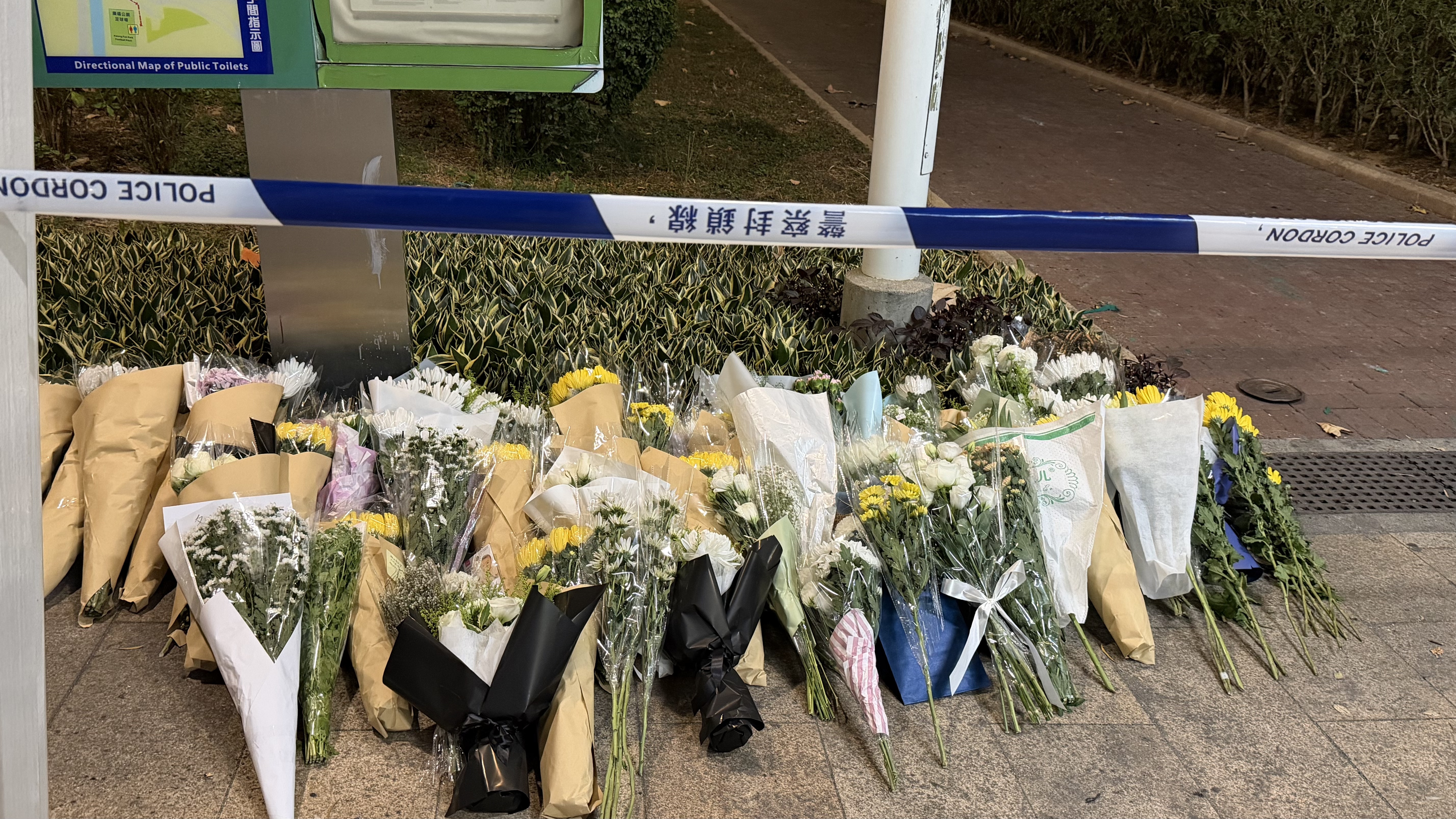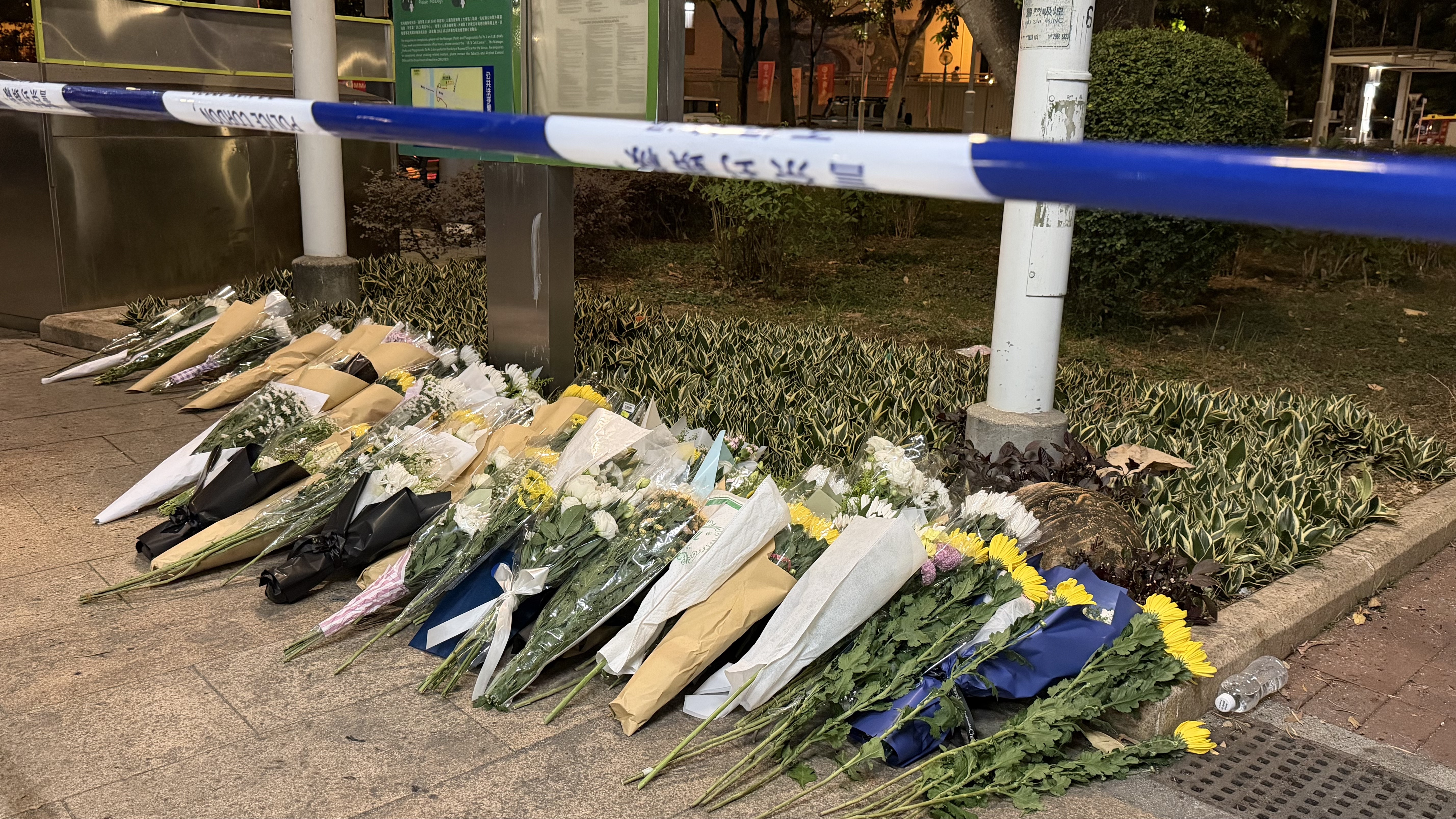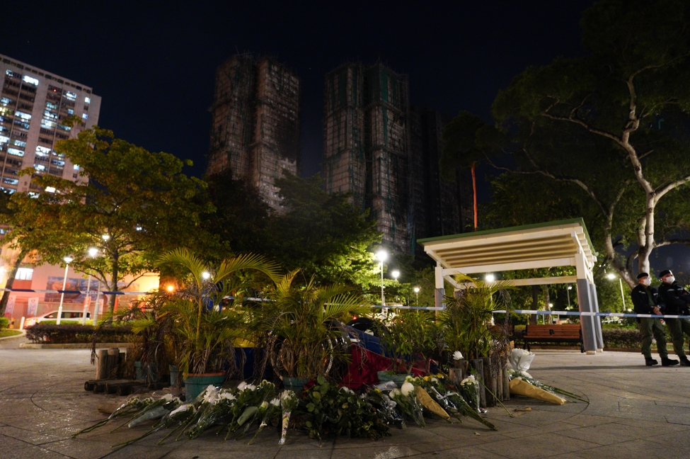 有市民逗留在火災現場附近,遠遠注視着宏富苑。有人低頭默哀,還有人將鮮花擺放在路旁。