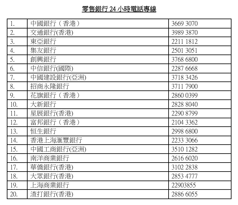 ·成立內部專責小組、開設電話專線及加強發放資訊──各零售銀行即日起設立由管理層領導的專責小組,統籌及靈活協調內部資源,指導前線職員靈活處理受災居民的個案,並開設24小時電話專線解答查詢(詳見文尾),以及在分行、網頁和社交媒體公布支援措施的詳情及更新;