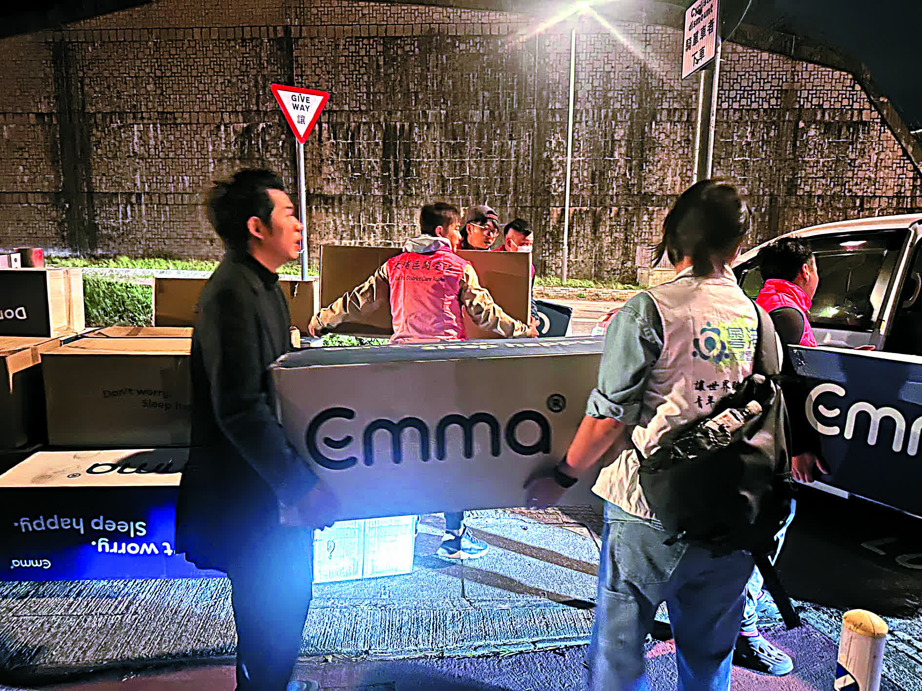 時近黃昏,天色已黑,一輛接一輛載滿物資的車輛仍不斷駛入船灣善樓(善導會)臨時庇護中心。食物、枕頭、床褥、充電線、衣架……義工們小跑着接力搬運,額頭的汗水在燈光下閃爍。這裏充滿此起彼伏的「我來幫你」「這邊還需要什麼」的溫暖呼應。