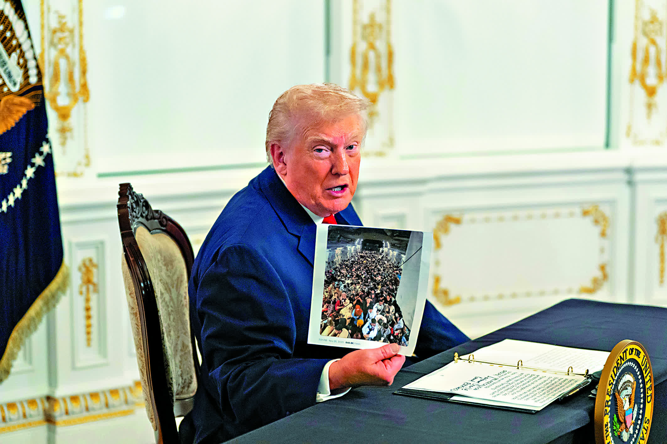 特朗普突然提到明尼蘇達州的索馬里難民,毫無根據地指控這些難民正在「佔領」該州,並帶來幫派暴力。被問到索馬里難民與阿富汗籍槍手有何關聯時,特朗普說:「沒什麼關聯,但索馬里人造成了很多麻煩,他們騙了我們很多錢。」他隨後開始攻擊代表明尼蘇達州的索馬里裔民主黨聯邦眾議員奧馬爾。特朗普還在社媒發文質疑明尼蘇達州州長、民主黨人沃爾茲智力有問題,並嘲笑奧馬爾戴頭巾。