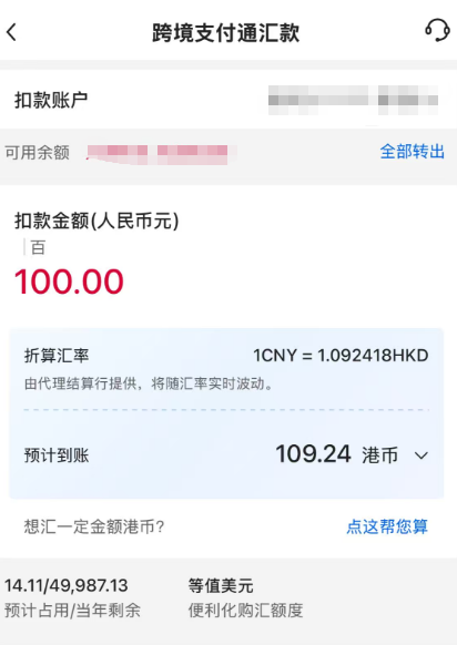 (如果首次使用,需填寫匯款人地址。)選取交易賬戶,輸入扣款金額,可選取到賬幣種。