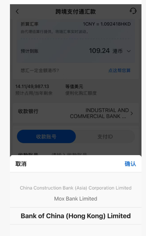 收款銀行選取中銀香港(BANKOFCHINA(HONGKONG)LIMITED)