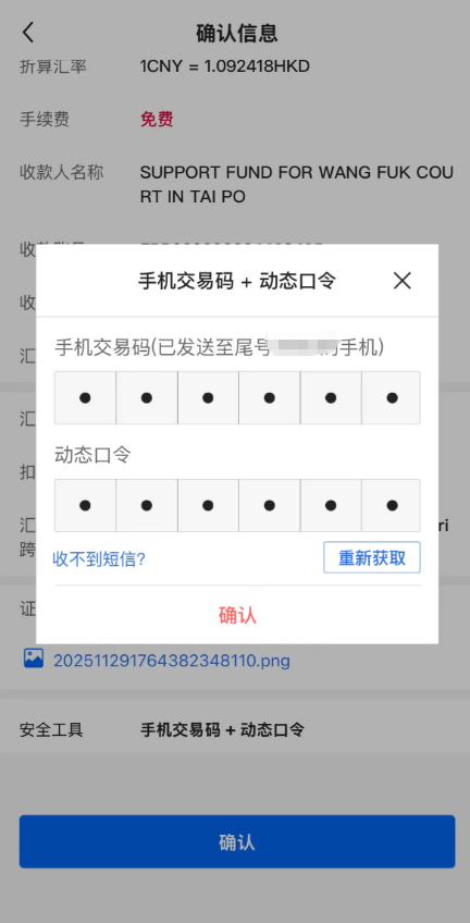 輸入手機交易碼和動態口令即可成功匯款