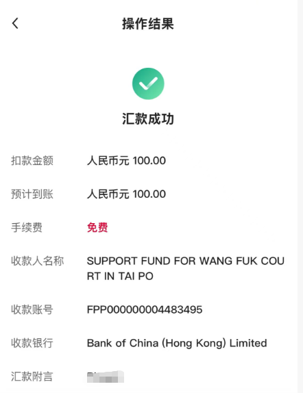 戶名:Support Fund for Wang Fuk Court in Tai Po