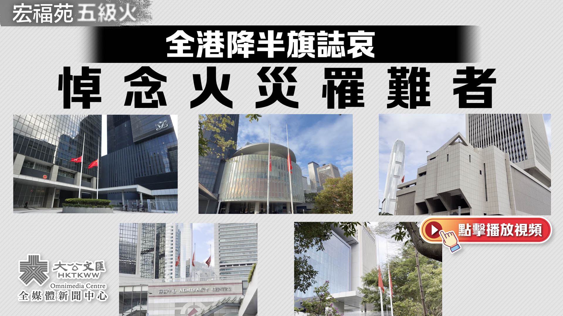 大公文匯全媒體報道,由今日(11月29日)起至12月1日,全港所有政府建築物及設施(包括特區政府駐境外辦事處)的國旗及區旗下半旗誌哀。大公文匯全媒體記者今日在政府總部、特首辦、立法會等看到,國旗、區旗下降半旗,此外,解放軍駐港部隊總部等亦降半旗。