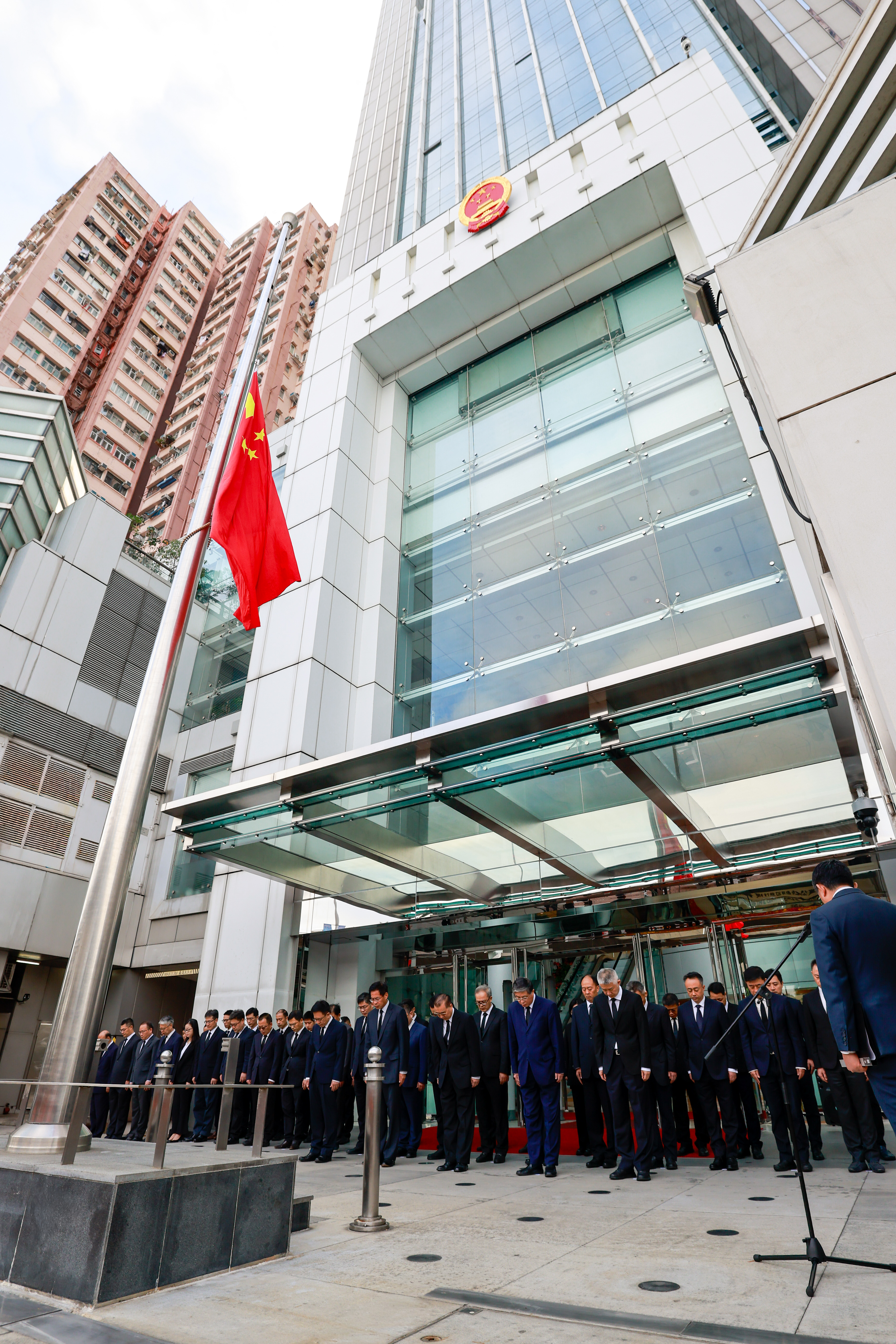 大公文匯全媒體報道,11月29日,香港特別行政區政府舉行降旗默哀儀式,香港特區行政長官李家超,中央港澳辦、國務院港澳辦分管日常工作的副主任徐啟方,中央港澳辦、國務院港澳辦副主任、中央政府駐香港聯絡辦主任周霽,中央港澳辦、國務院港澳辦副主任農融等出席。中央政府駐香港聯絡辦同時舉行降旗默哀儀式,向香港新界大埔屋邨宏福苑多棟住宅樓重大火災事故遇難人員和殉職的消防員致以深切哀悼。