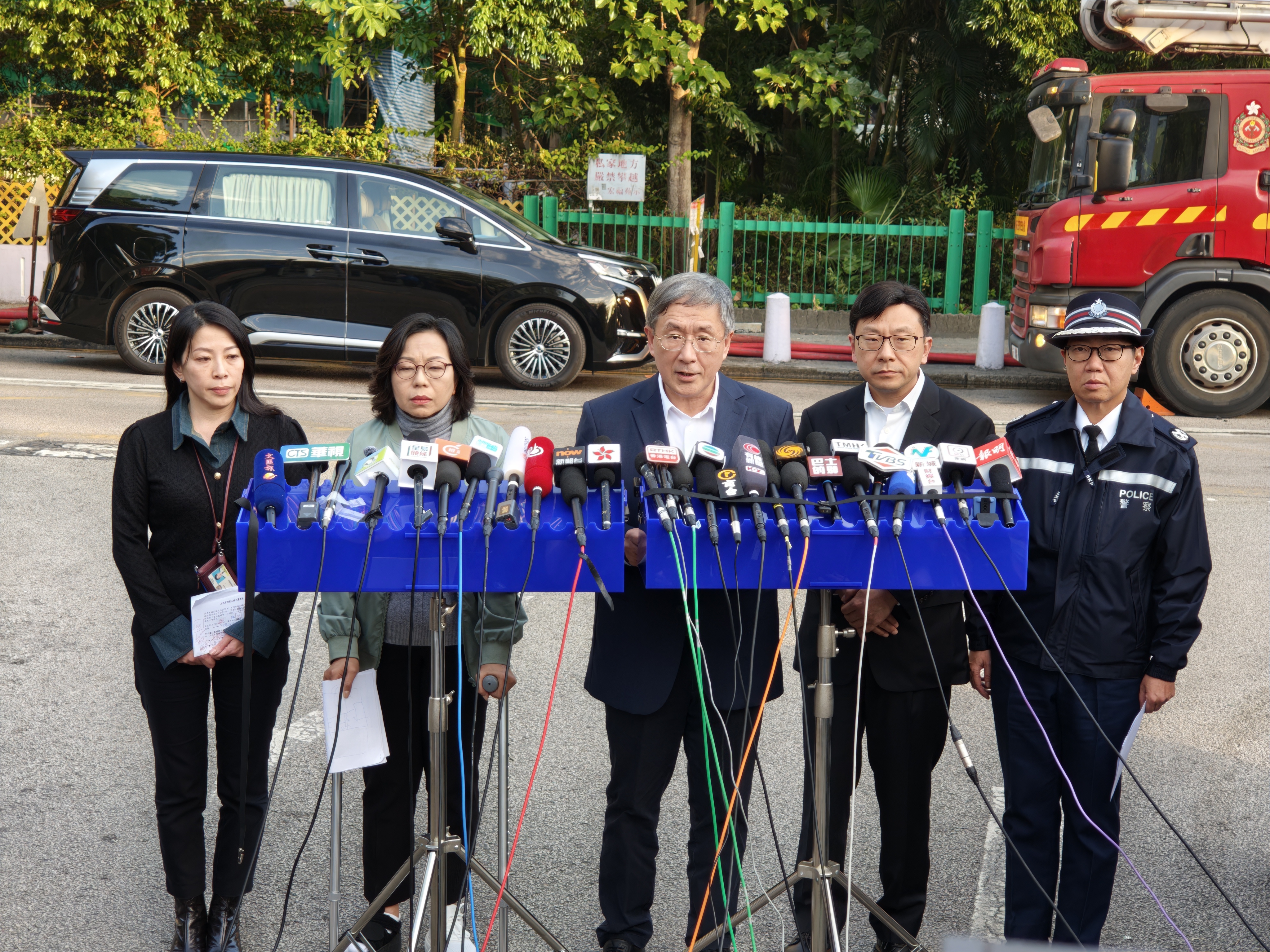 大公文匯全媒體報道,大埔宏福苑11月26日下午發生五級大火,造成多人死傷。今日(29日)下午,政務司副司長卓永興、民政及青年事務局局長麥美娟、勞工及福利局局長孫玉菡、警務處新界北總區指揮官助理處長林敏嫻、警務處傷亡查詢中心主管總警司曾淑賢等政府官員,在宏福苑火警現場視察,向相關人員了解情況後見記者。
