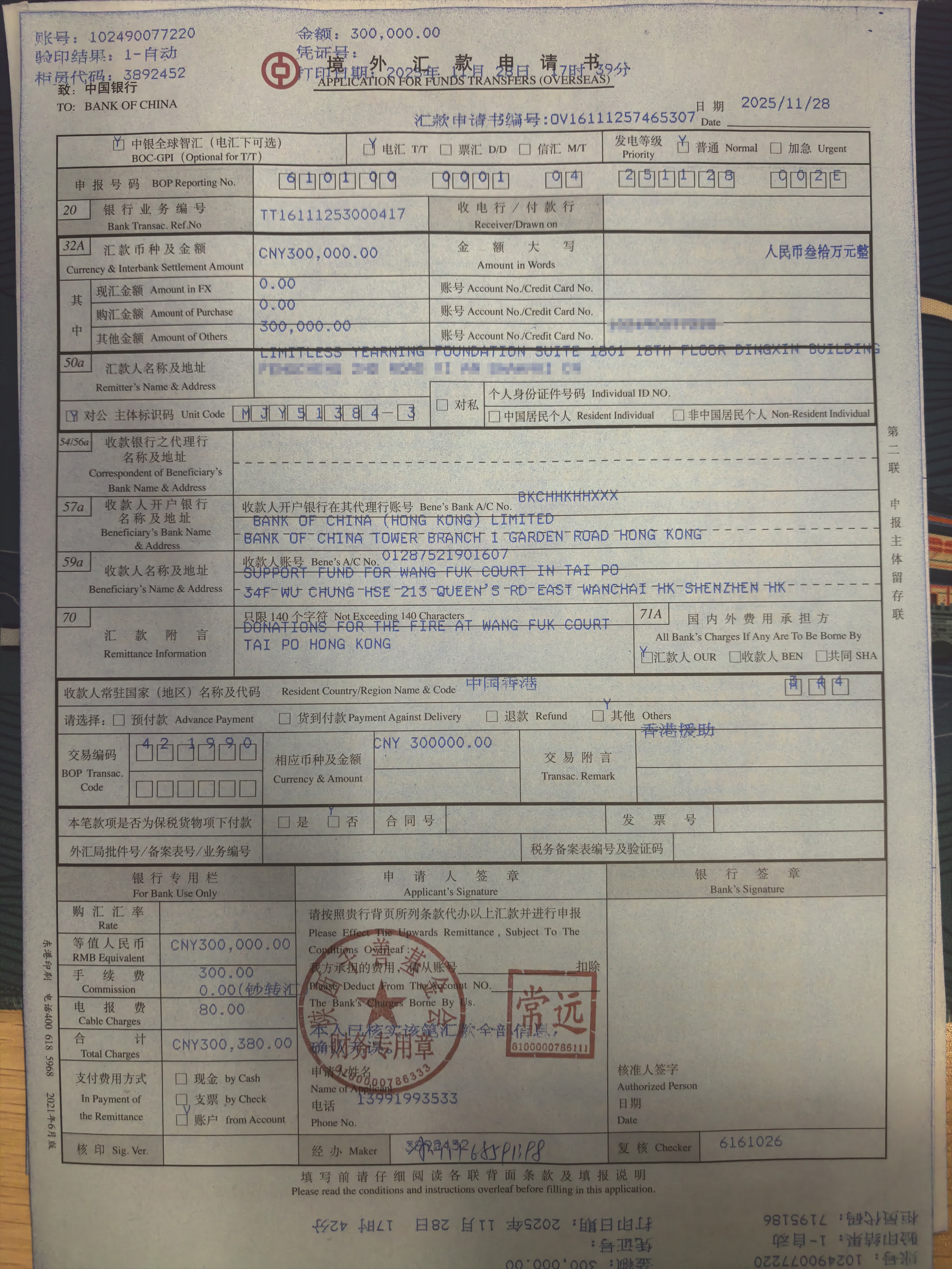 11月26日,香港大埔宏福苑突發嚴重5級火災,造成重大人員傷亡,引發全國關切。28日,陝西千善基金會通過中國銀行的跨境捐贈綠色通道緊急捐贈30萬元人民幣至香港特區政府的「大埔宏福苑援助基金」賬戶,用於受災同胞緊急安置及過渡期基本生活保障所需。