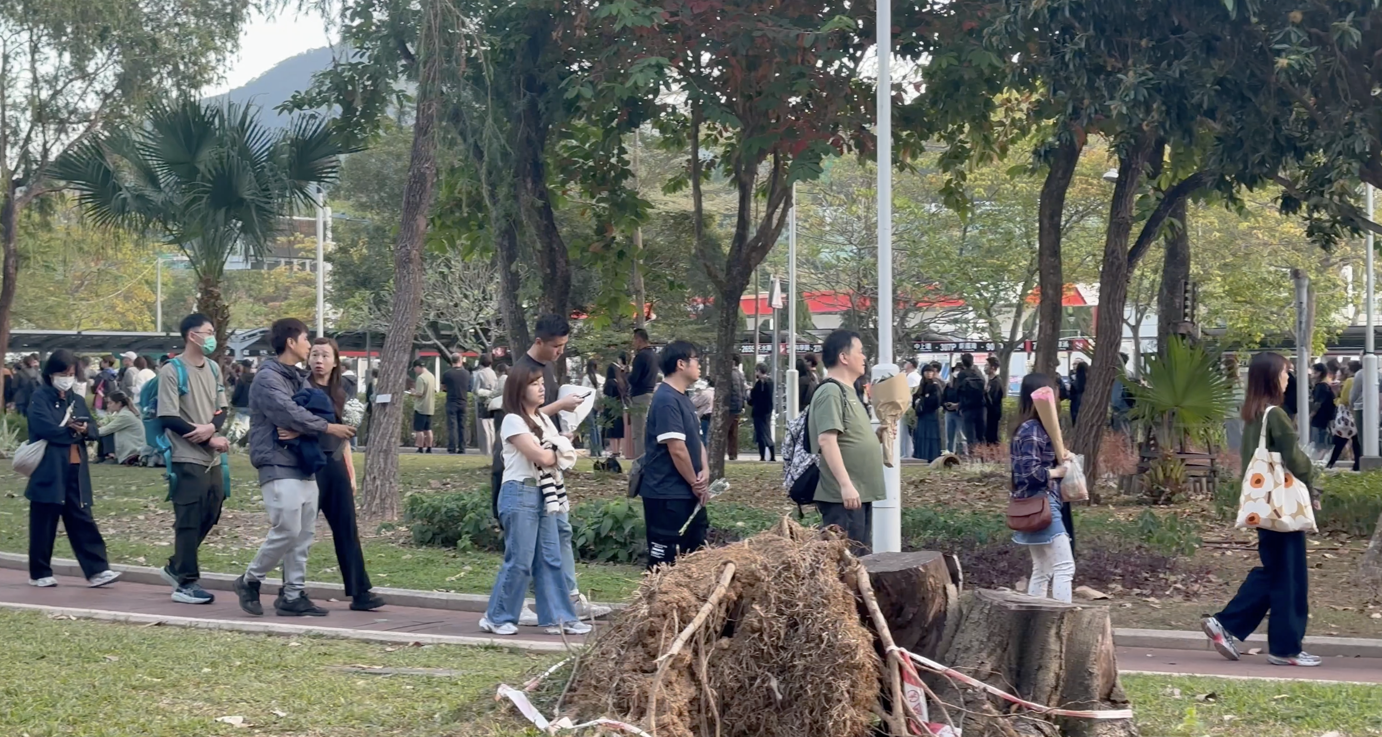人們安靜地抱着鮮花,順着大埔河向宏福苑方向前行。行至廣福休憩處,一部分人找到獻花隊伍的龍尾開始排隊,另一些人則選擇繼續前行,到更靠近宏福苑的廣福公園獻花。