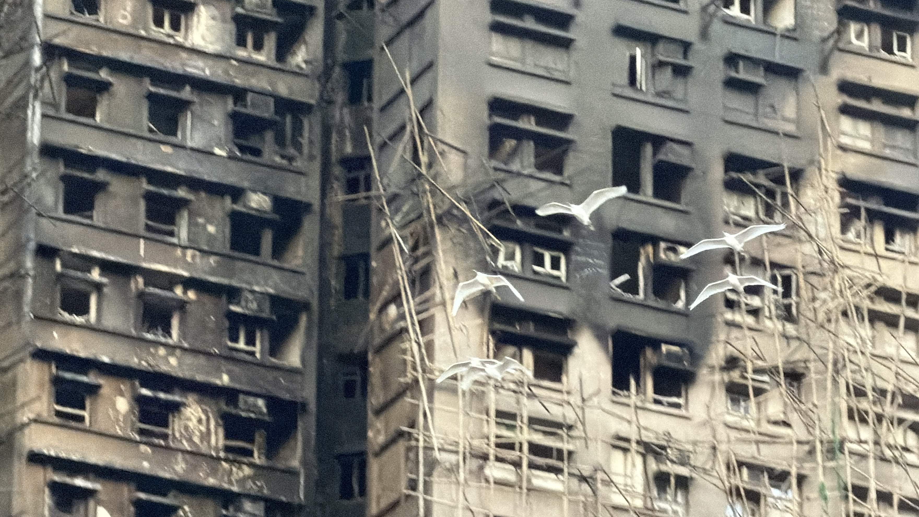 夕陽下的宏福苑,火災留下的痕跡黑白分明。燒的最嚴重的幾座,部分外牆漆黑,一看就能感受到火災時的慘烈。