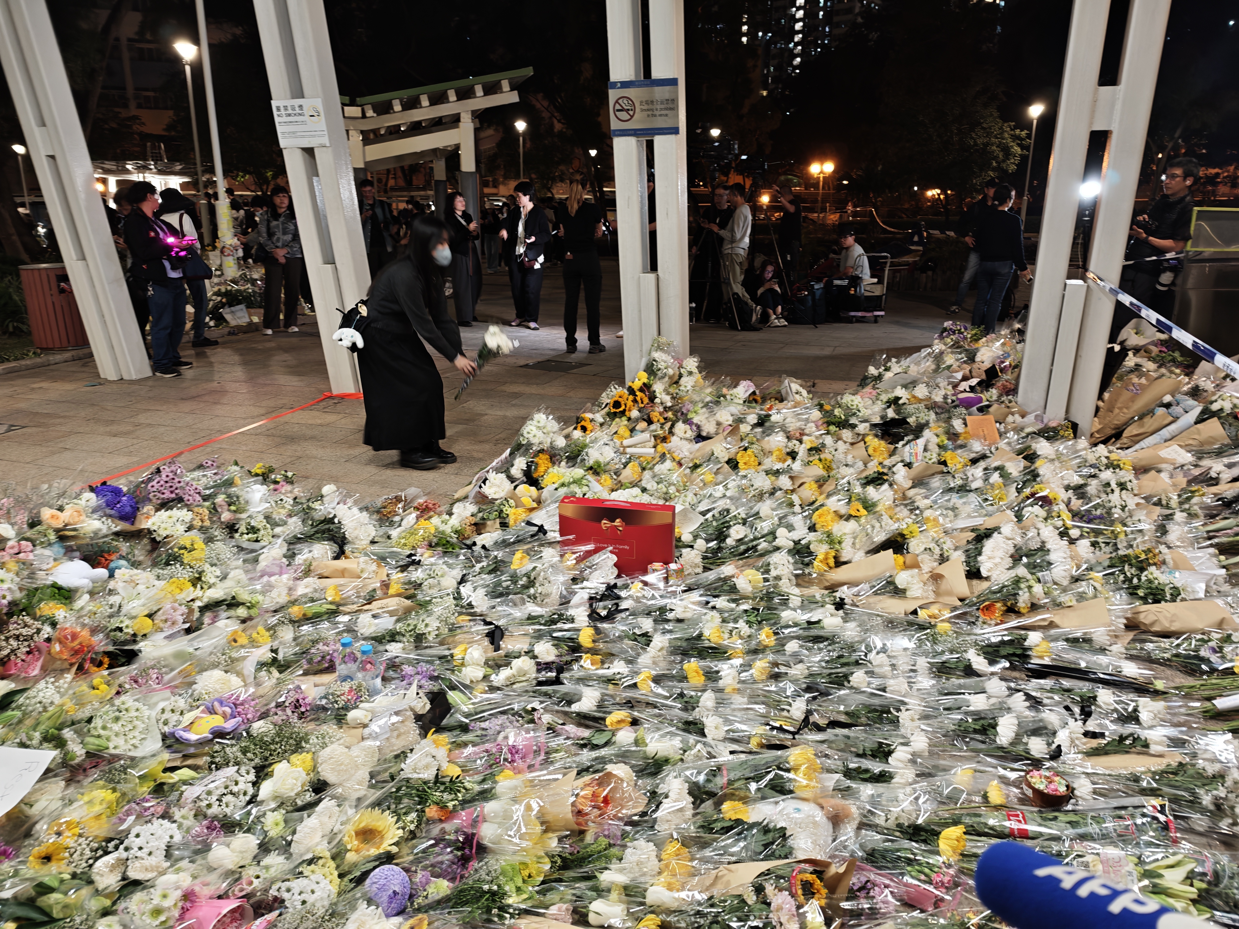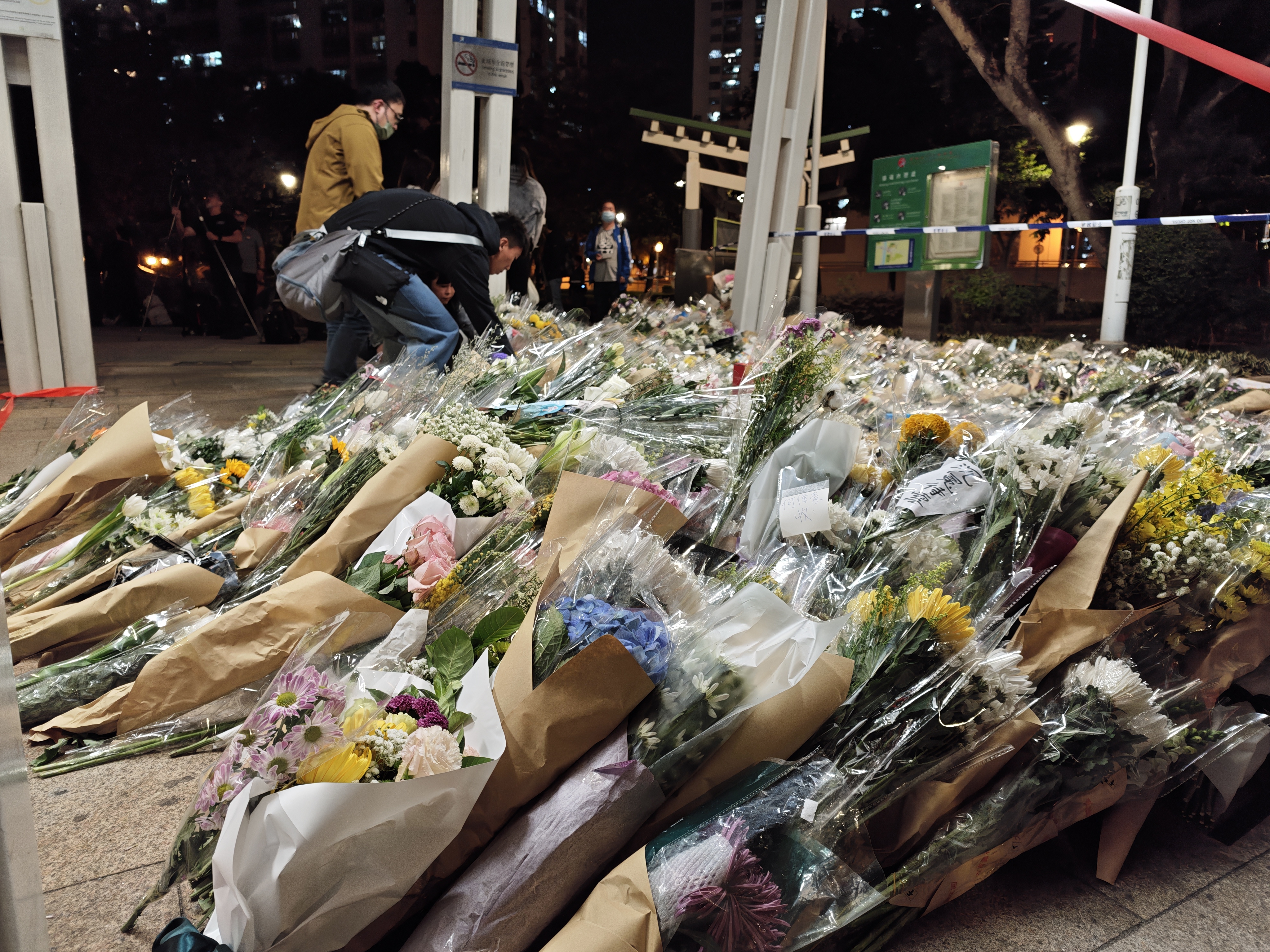 (大公文匯全媒體記者 劉鴻霖)大埔宏福苑11月26日下午發生五級大火,造成重大人員傷亡,已導致128人罹難,83人負傷。大批市民今晚(29日)齊聚鄰近的廣福休憩處,獻上鮮花悼念罹難者。