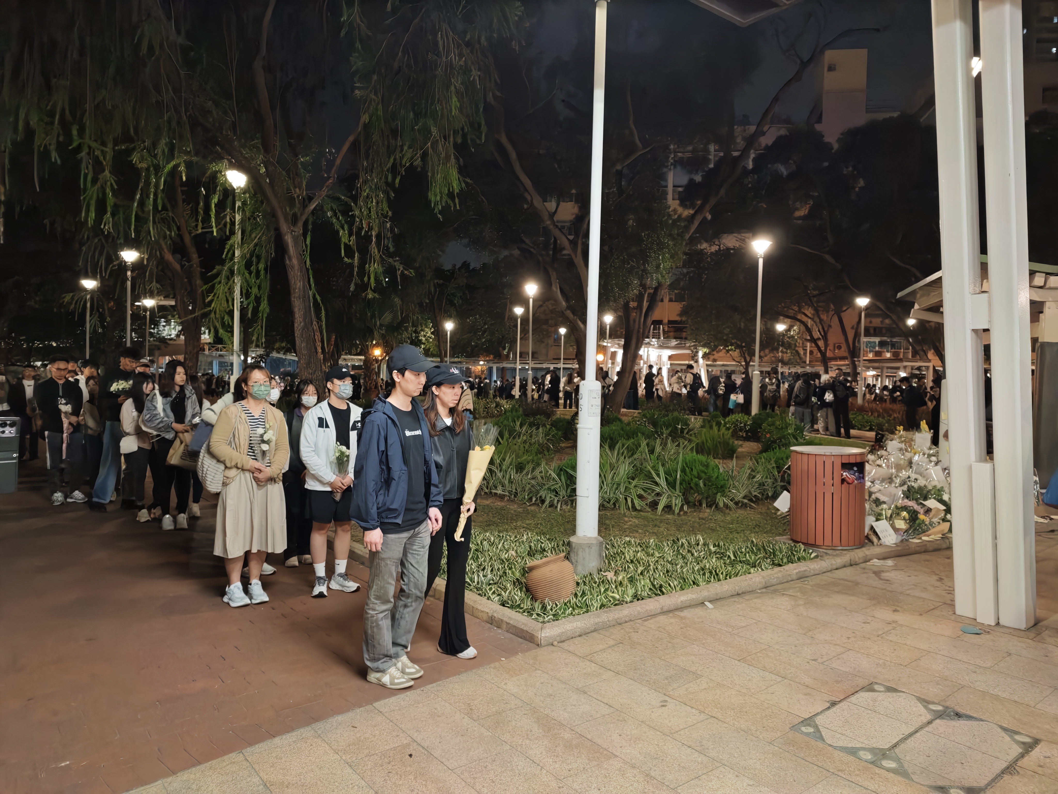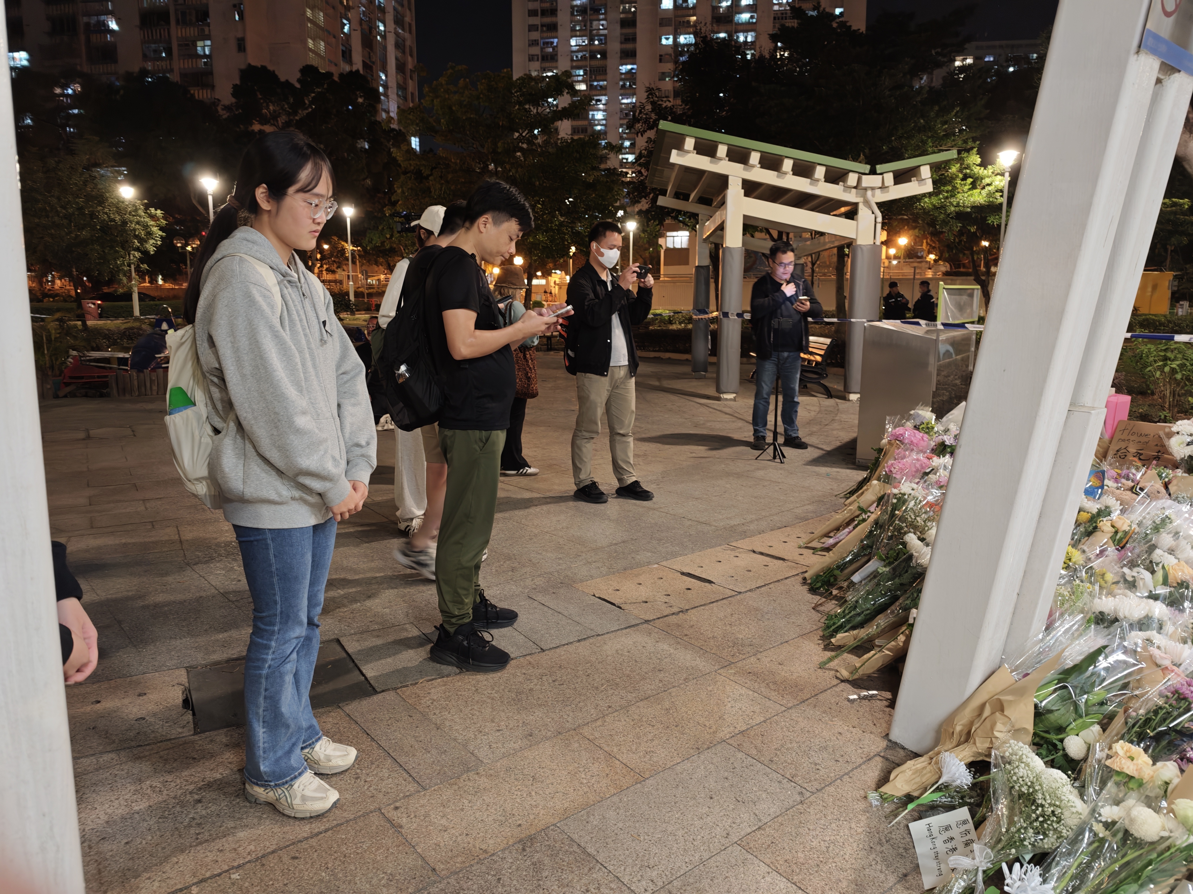 大公文匯全媒體記者在現場目睹,下午5時許,廣場平台已出現獻花人龍,其後隊伍持續延長,直至晚上8時將整個廣場擠滿。市民有序排隊,輪流奉上花束,朵朵鮮花逐漸鋪陳於地面,匯聚成一片花海。獻花後的市民,駐足在宏福苑大樓前,久久不忍離開。