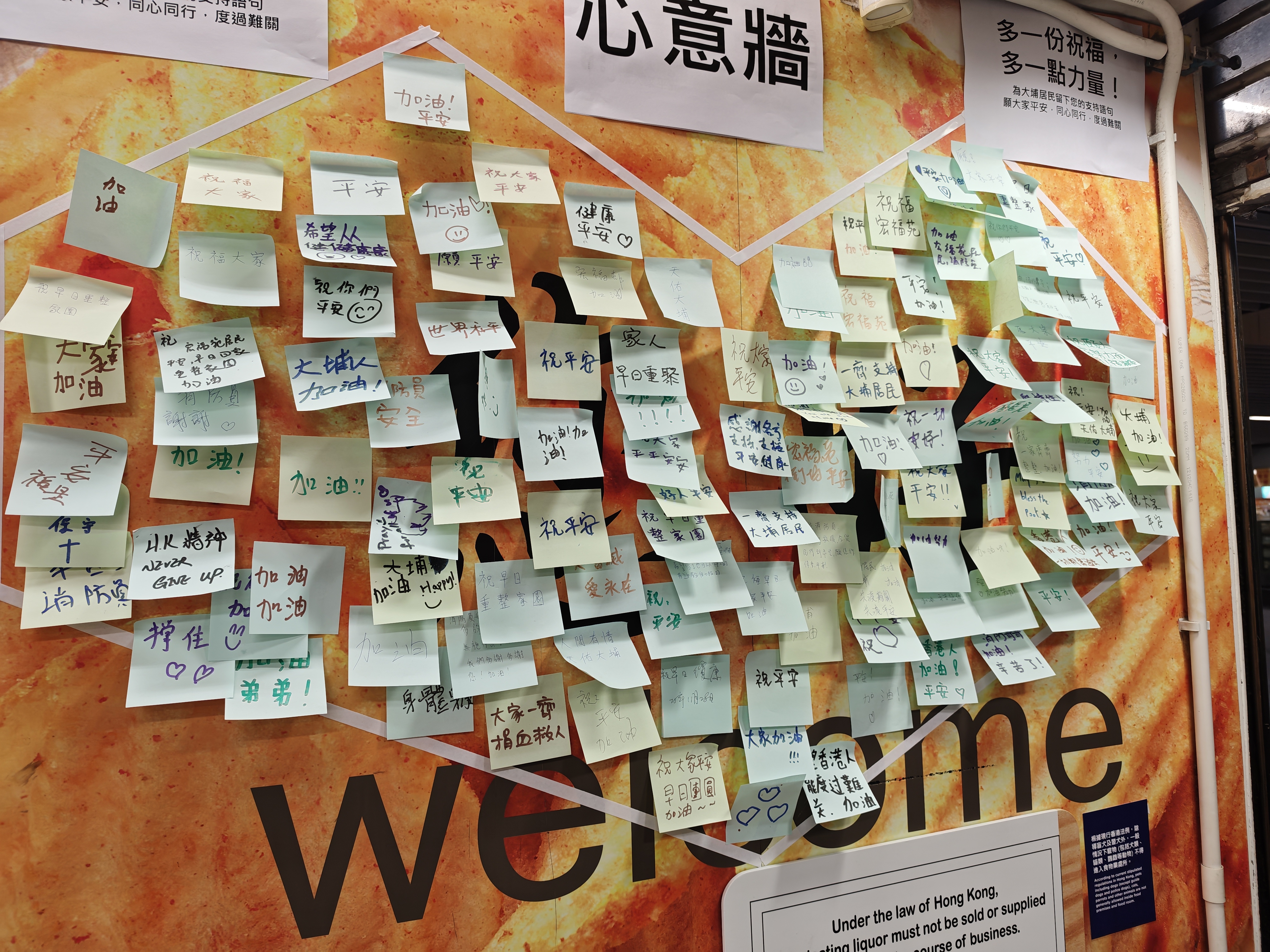 在宏福苑附近,有商戶設置了心意墻,許多港人在此留言:「祝平安」、「大埔人加油!」