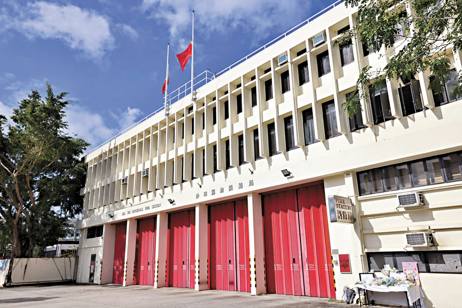 昨日上午約8時,何偉豪生前駐守的沙田消防局下半旗誌哀及舉行默哀儀式。其間,有消防員從災場返回消防局默哀後,未幾便要再出動。