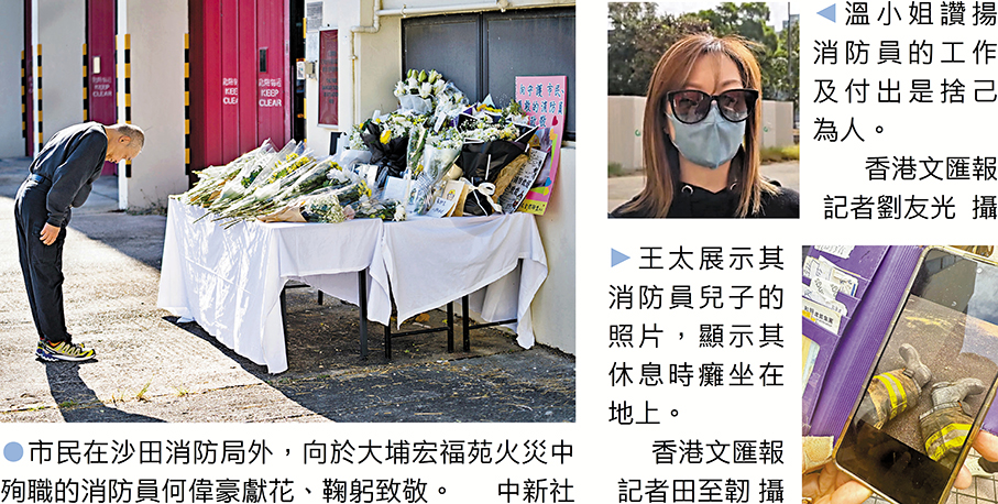 (香港文匯報記者 田至韌、康敬、蕭景源)在宏福苑大火中,香港消防員英勇無畏、徹夜救災的表現令人讚賞。不幸地,37歲的消防員何偉豪在烈火中英勇殉職。他生前駐守的沙田消防局昨日下半旗誌哀及舉行默哀儀式。大批市民到場獻花致敬及送上心意卡悼念,讚揚消防員的工作及付出:「多謝佢捨己為人,為人民服務。」有消防員家屬和退休消防處救護員亦專程到弔唁處悼念何偉豪等罹難者。