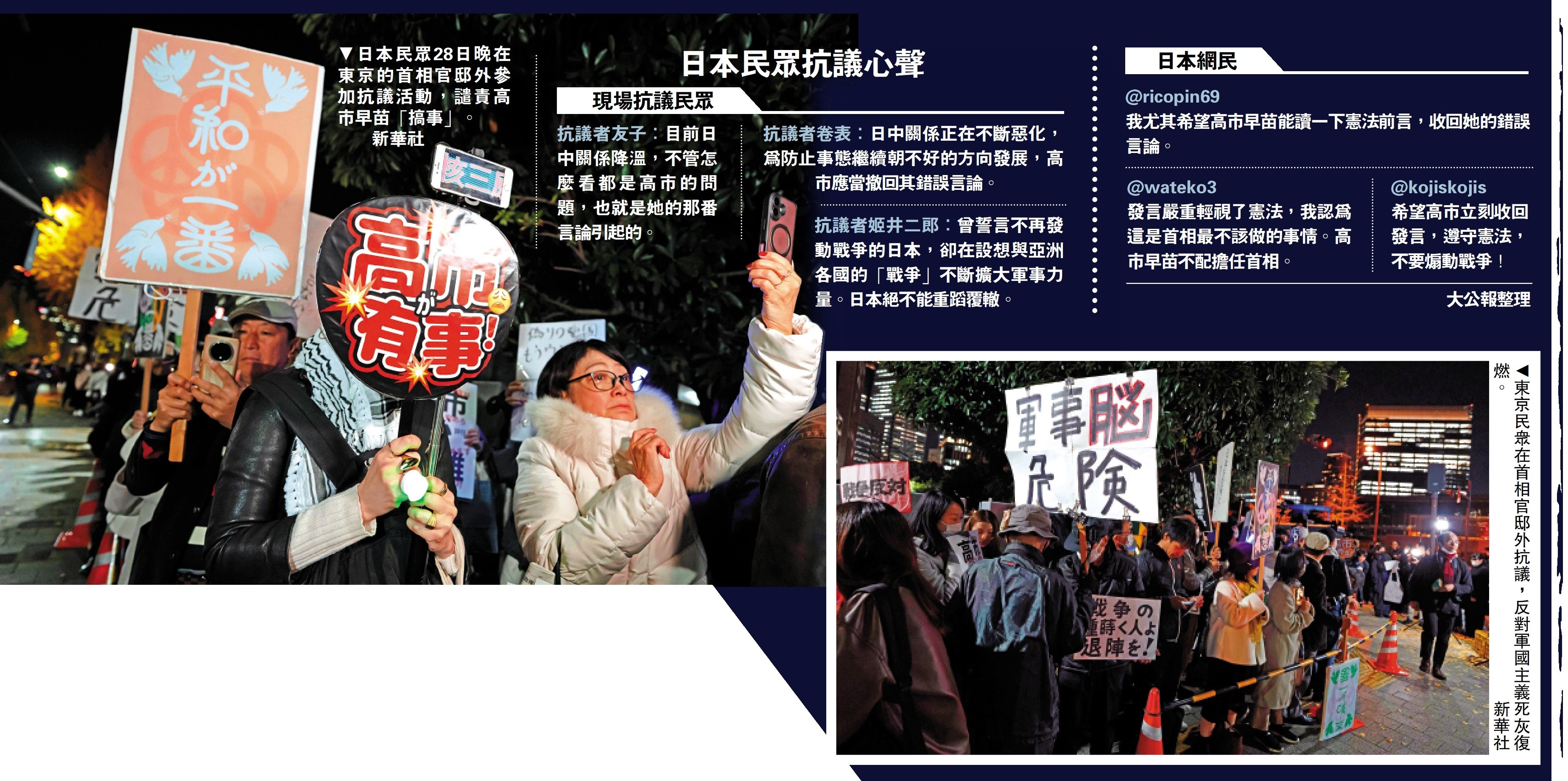 繼11月15日和21日之後,日本民眾連續三周周末晚間,在位於東京的首相官邸前集會,抗議高市早苗發表涉台錯誤言論。據報道,當晚,抗議者在首相官邸前共同朗讀和平憲法的序言和第9條。根據日本和平憲法,其序言共四個段落,強調日本將確保「消除因政府的行為而再次發生的戰禍」,並信賴「熱愛和平的各國人民的公正與信義」來維護自身的安全與生存。這一思想直接引向和平憲法第9條「放棄戰爭」的條款,該條款亦是整部和平憲法最核心的地方。有民眾指出,高市早苗應當重新閱讀和平憲法序言,撤回涉台錯誤言論。