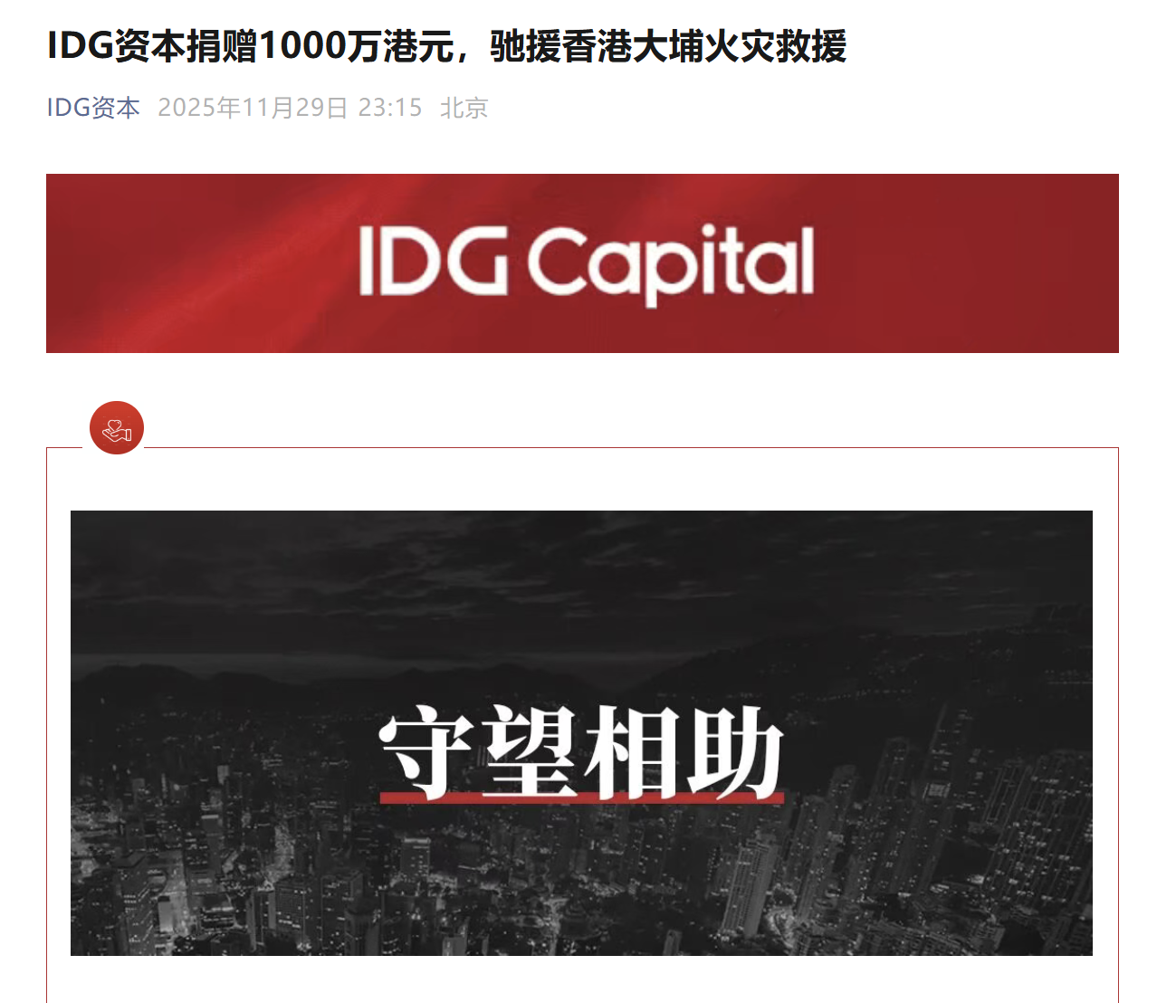 大公文匯全媒體報道,大埔宏福苑11月26日下午發生五級大火,造成嚴重死傷。為支援大埔宏福苑火災救援及災後重建工作,IDG資本昨日(11月29日)宣布捐贈1000萬港元,專項用於災區緊急救援、傷患救治、物資採購、受災民眾生活安置以及後續社區重建等。