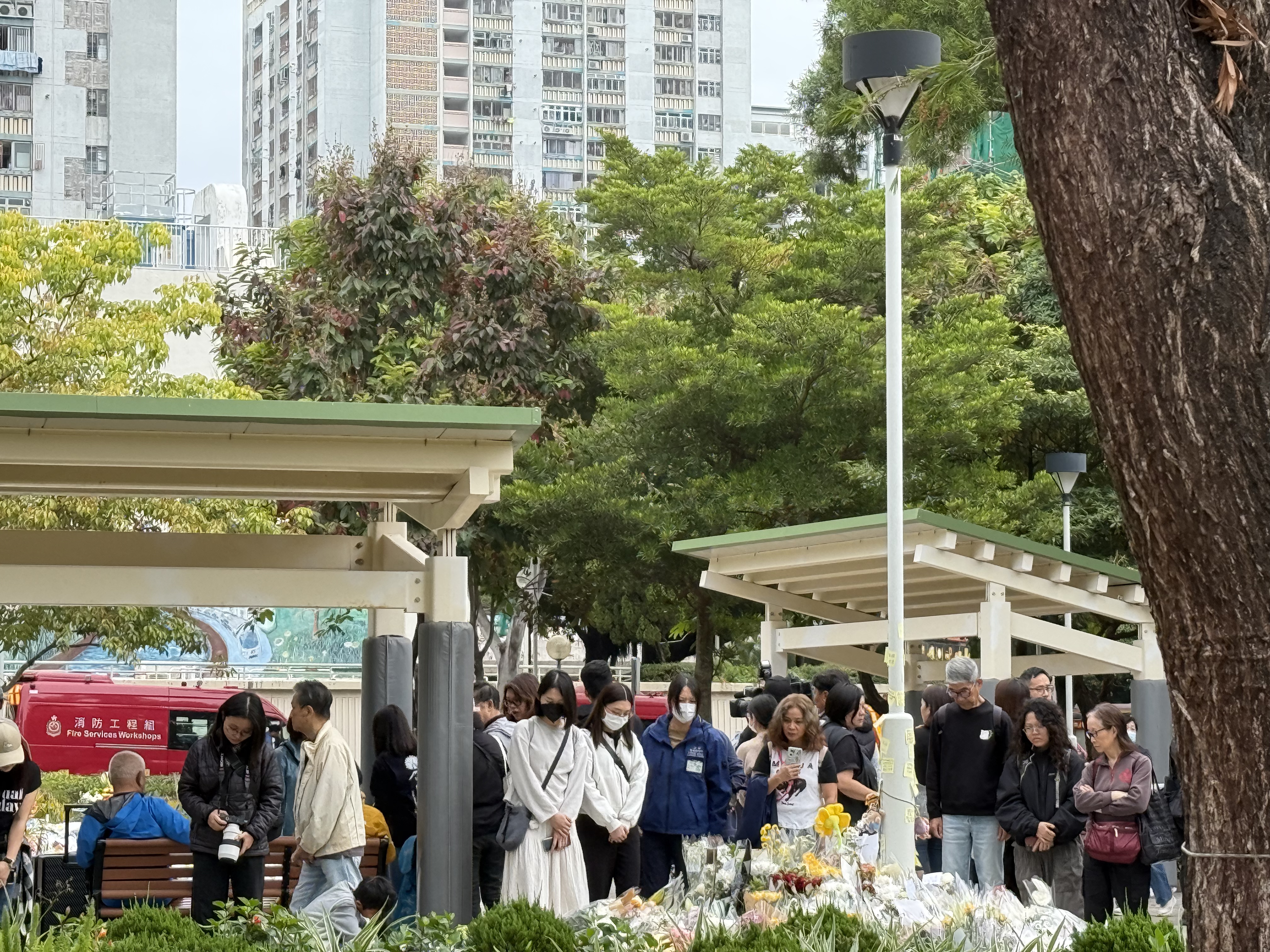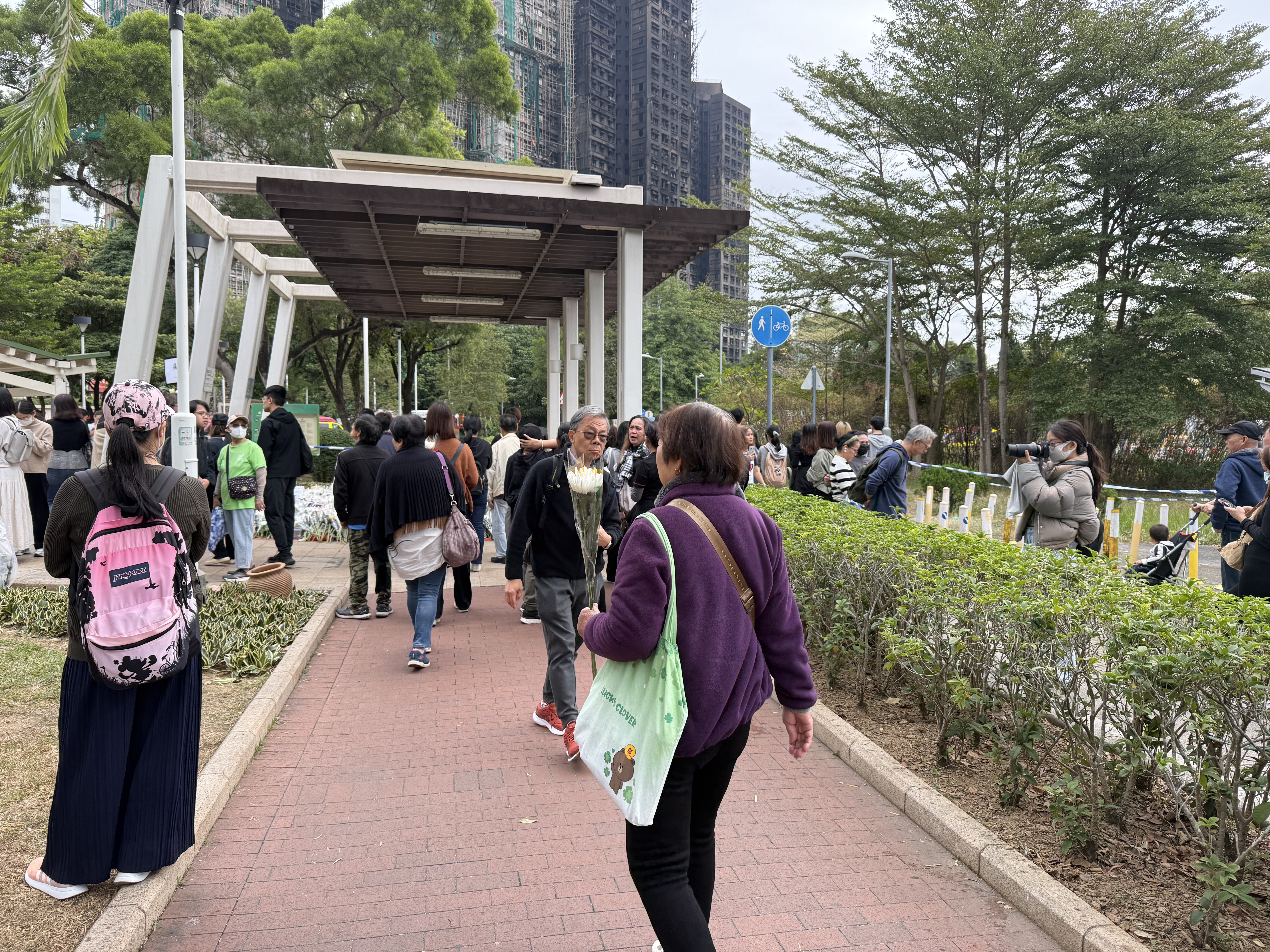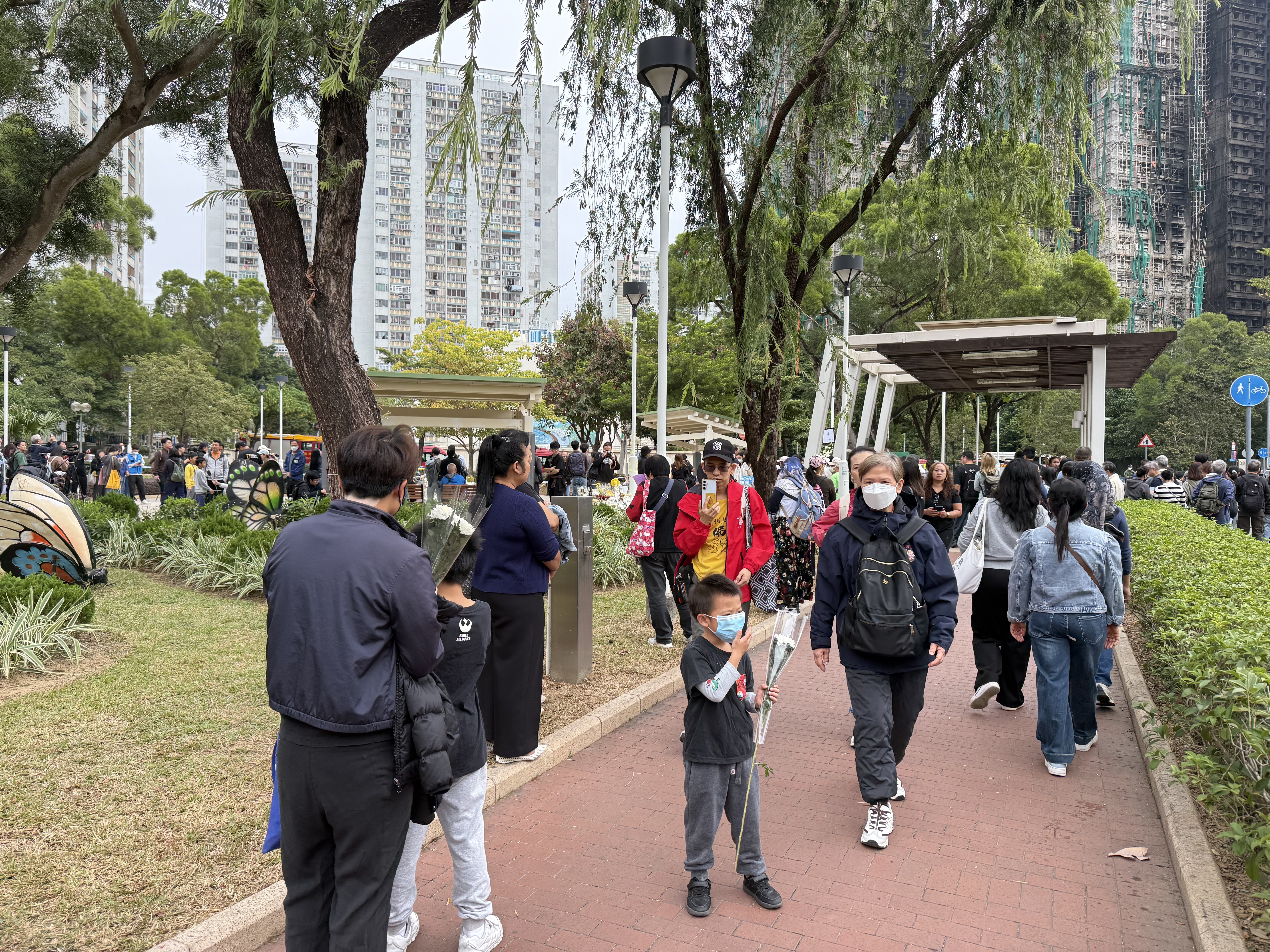 大公文匯全媒體報道,大埔宏福苑11月26日下午發生五級大火,造成嚴重死傷。特區政府昨日(29日)在政府總部舉行悼念儀式,沉痛哀悼在大埔宏福苑火災不幸罹難的人士,全港所有政府建築物及設施的國旗及區旗下半旗誌哀,同時不少市民紛紛前往廣福休憩處獻花悼念罹難者。今日(30日)仍有不少市民攜帶鮮花前往宏福苑附近悼念,早上9時30分,點新聞記者看到已有大批市民齊聚宏福苑附近獻花悼念罹難者,還有市民邊走邊落淚。