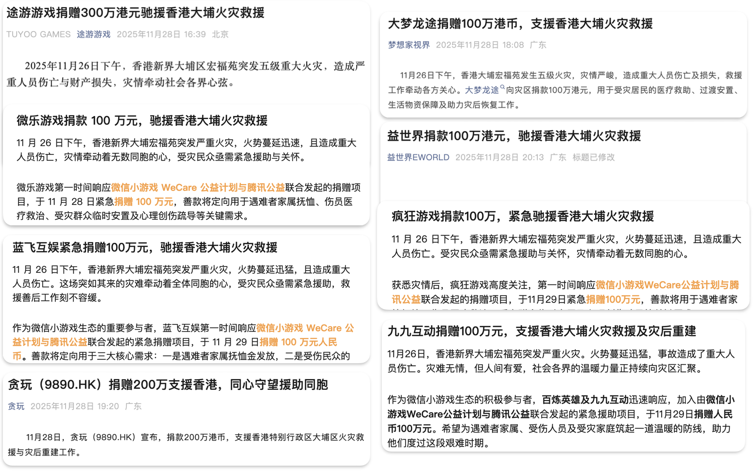 (大公文匯網 記者 郭若溪)11月26日下午,香港大埔宏福苑發生五級火災,災情嚴峻,牽動各方關心。隨着救援行動持續推進,微信小遊戲開發者們也迅速反應,通過各個渠道貢獻力量,馳援香港。截至11月30日9點,開發者們通過微信小遊戲WeCare公益計劃和其他愛心渠道捐出的善款總額已超過1000萬元。