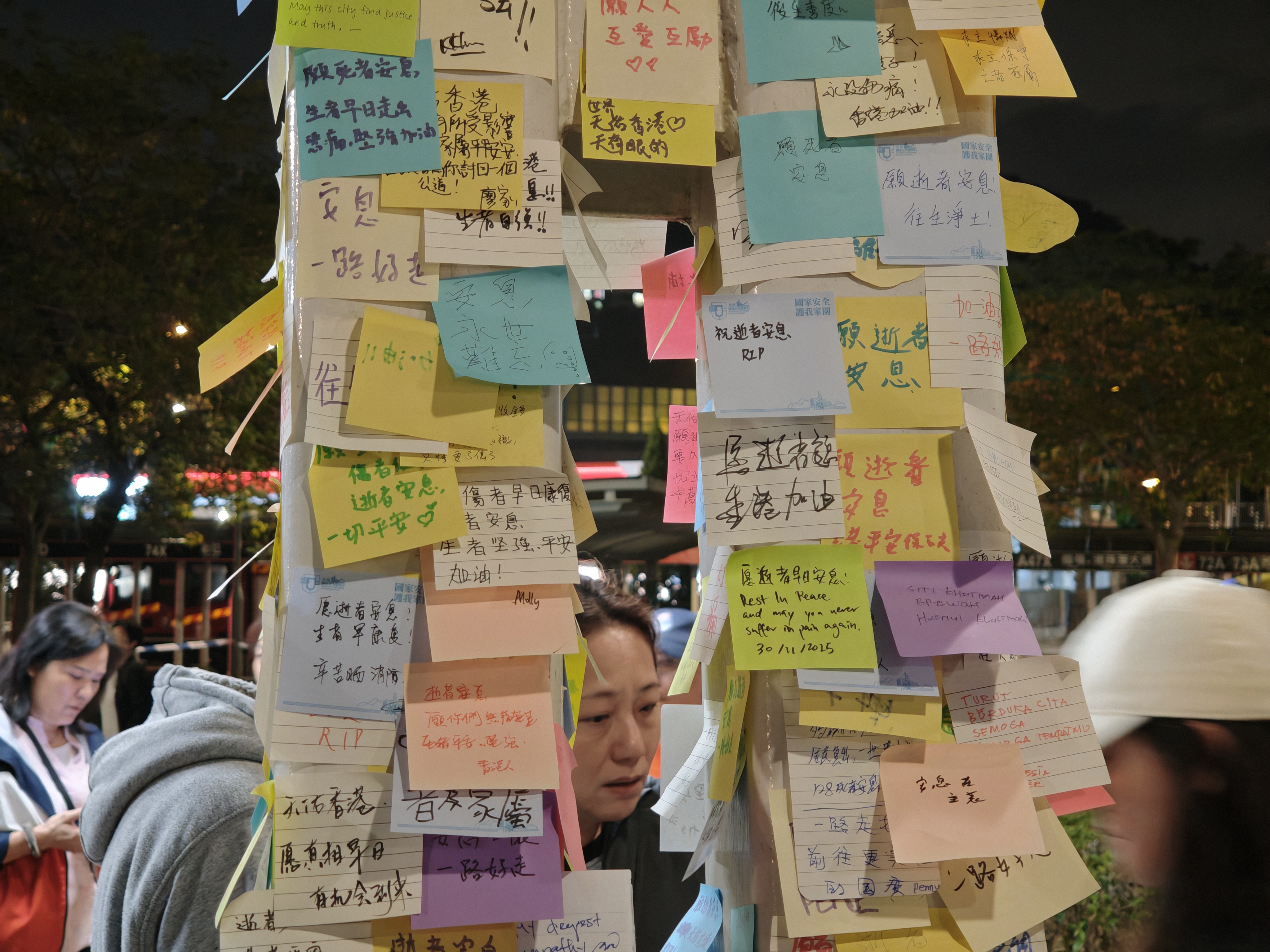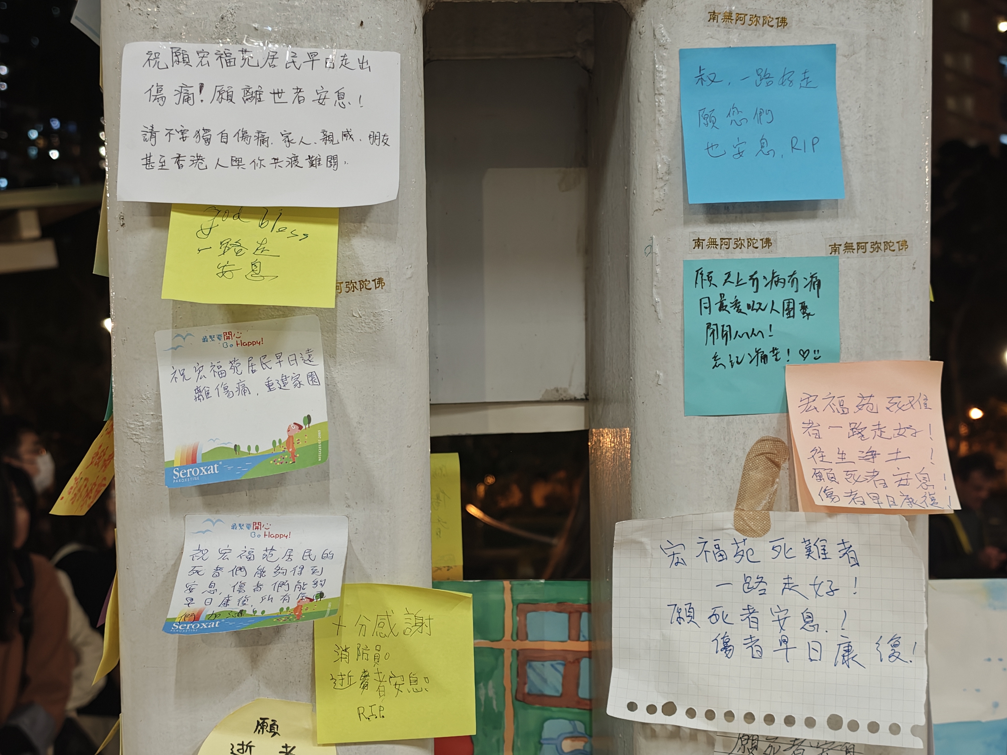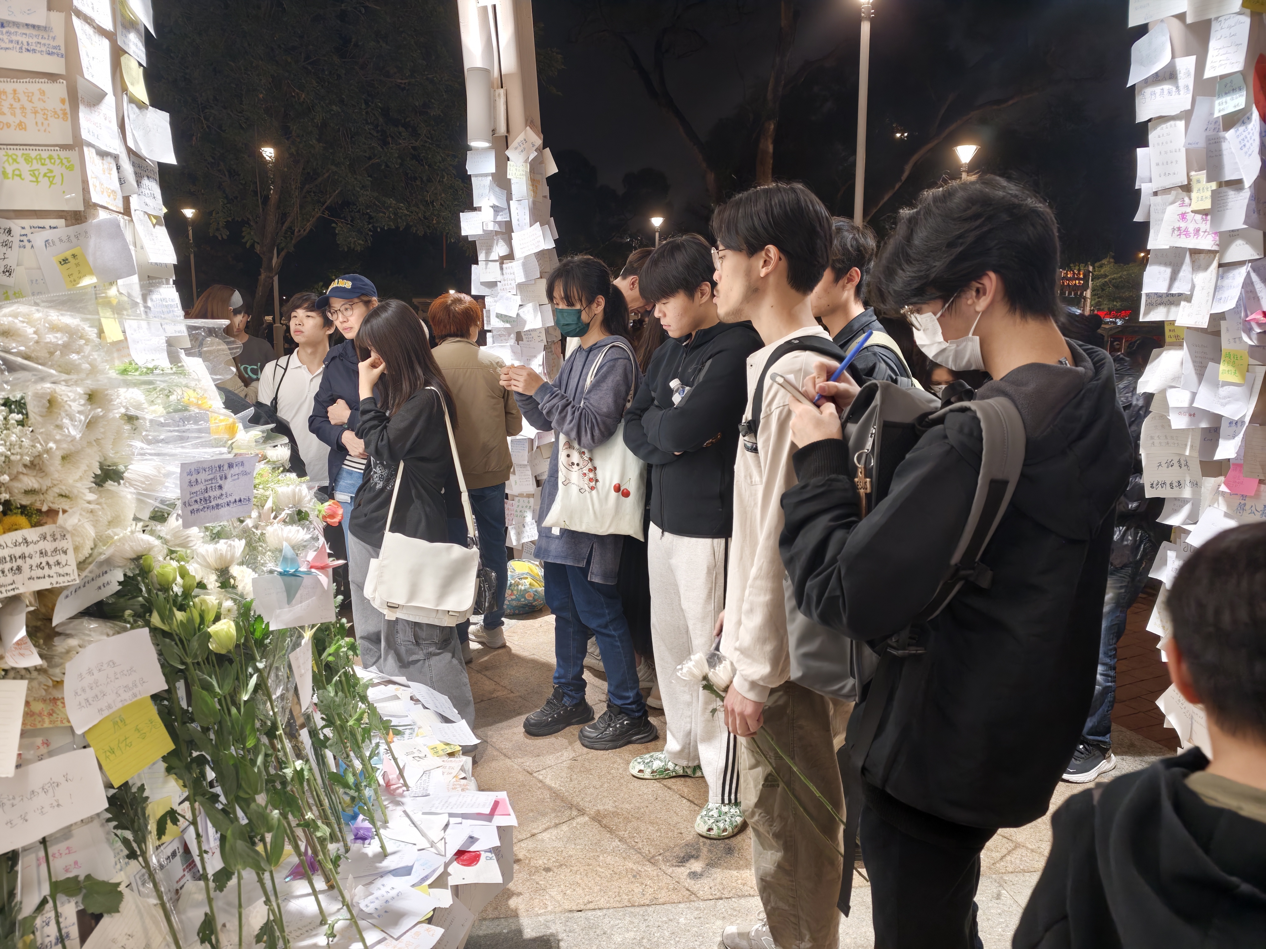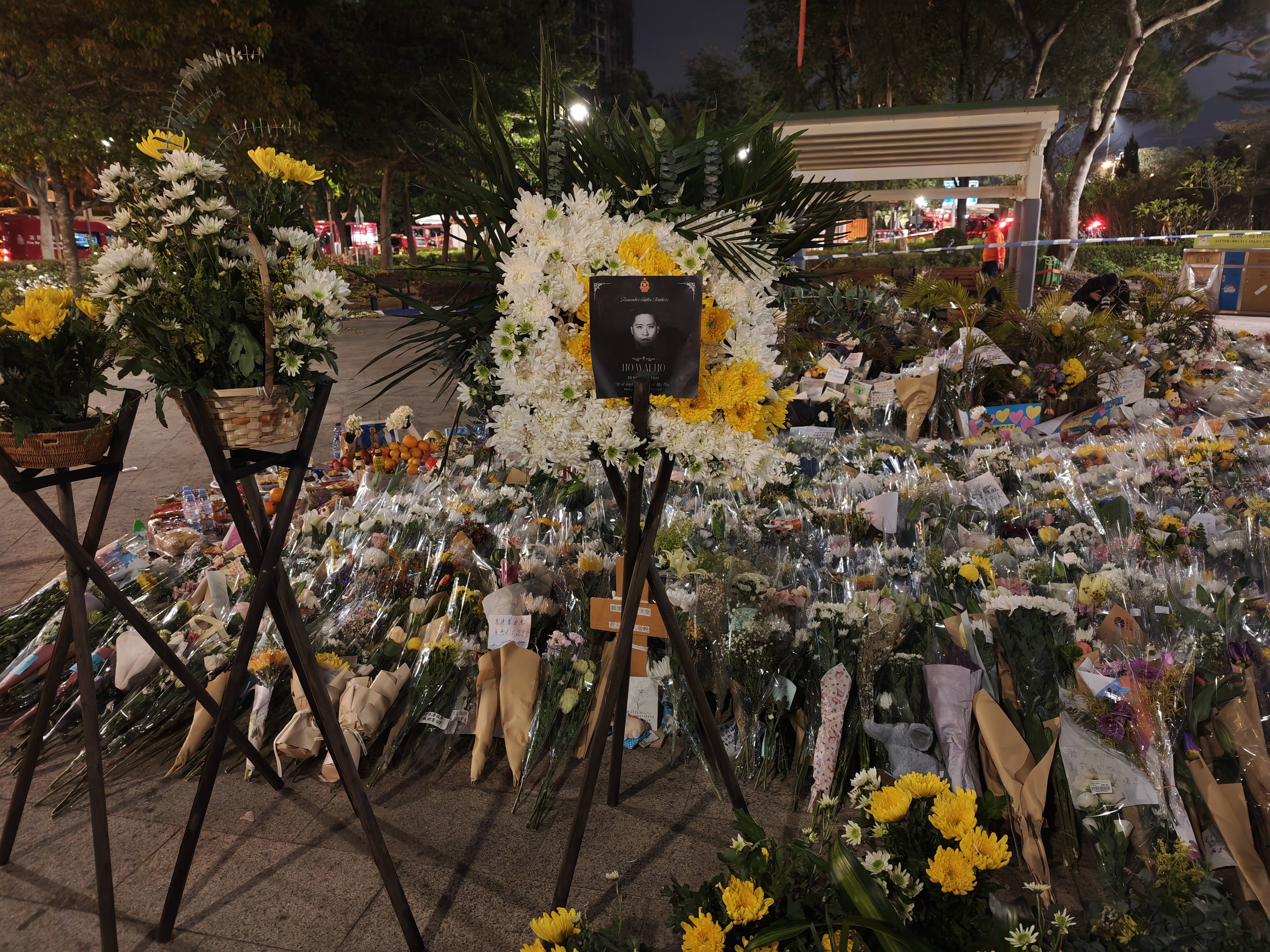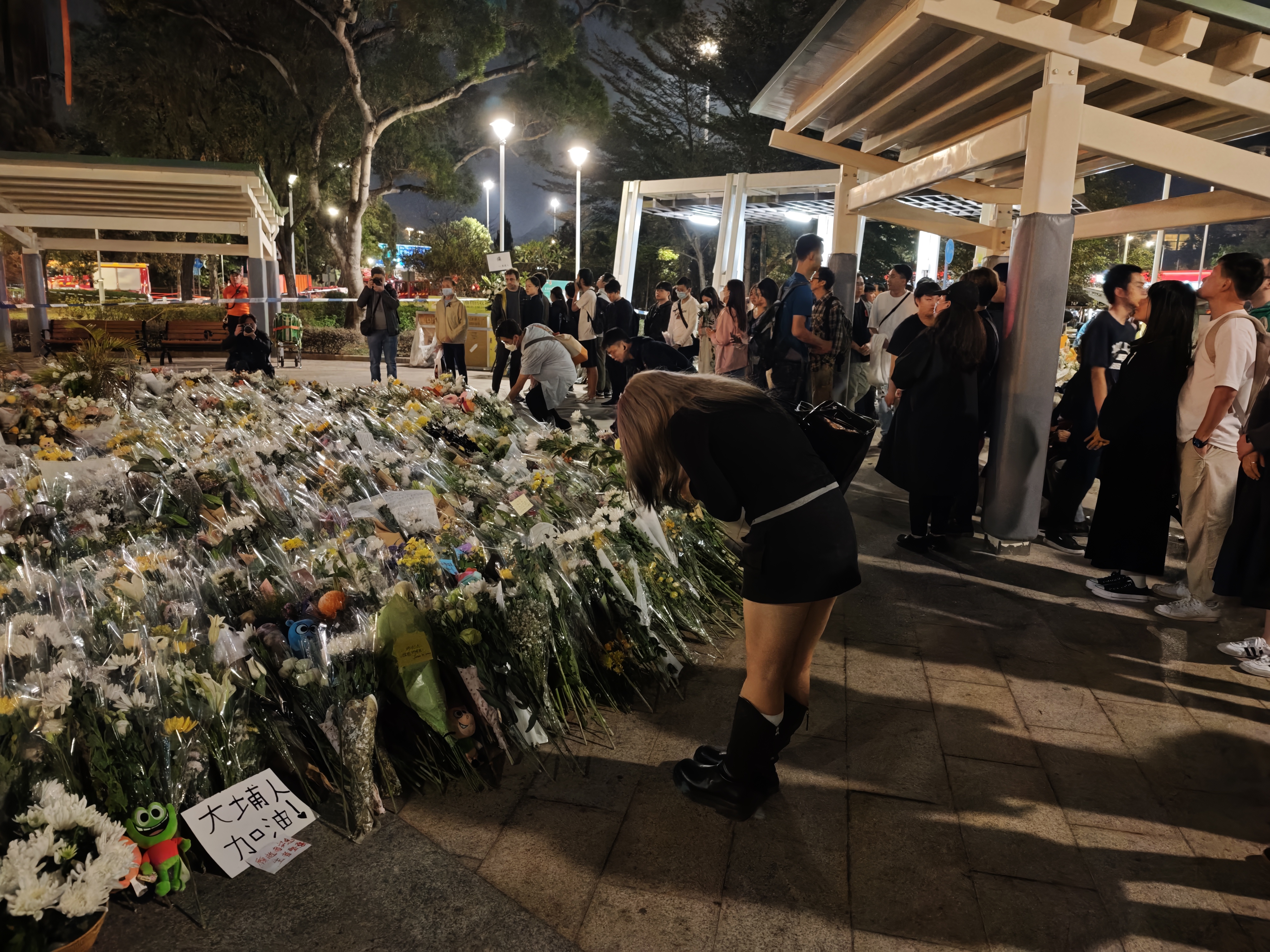 大公文匯全媒體記者在現場看到,現場擺滿了鮮花,即使到了晚上,仍有市民為遇難者及殉職消防員送花。在廣福休憩處涼亭,心意卡覆滿柱子,層層疊疊,滿載市民哀思及為災民的祈福;「願逝者早日安息,生者早日走出悲痛」是市民的共同心願。