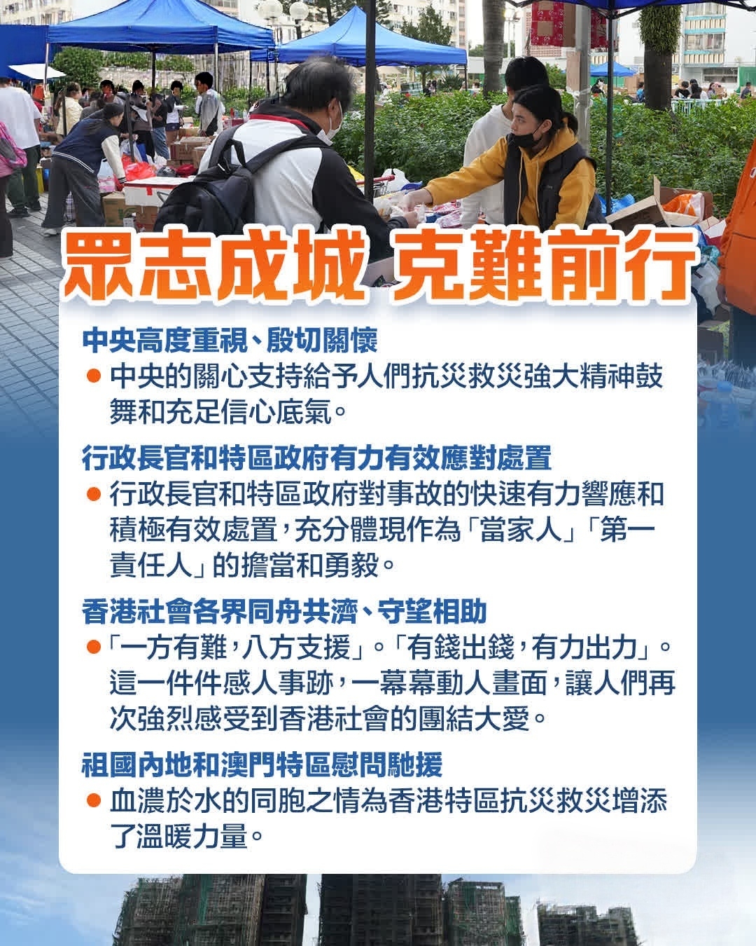 11月26日香港新界大埔屋邨宏福苑火災事故,令人痛心疾首。在災難面前,從中央到香港特區,從政府到民間,從香港到內地,迅速回應、團結協作,迅速匯聚為抗災救災磅礴力量,充分展現人間有情、團結大愛。充分展現了中國共產黨和中央政府始終以人民為中心的發展思想,體現了中華民族一方有難、八方支援的優良傳統。