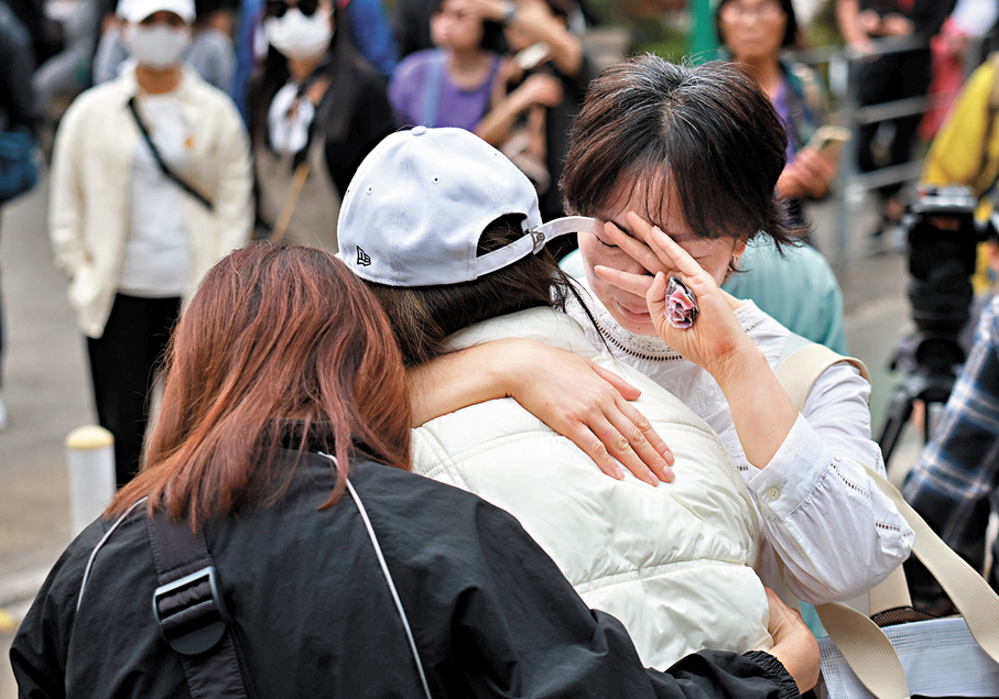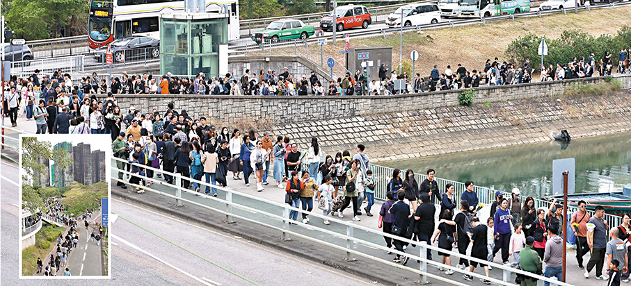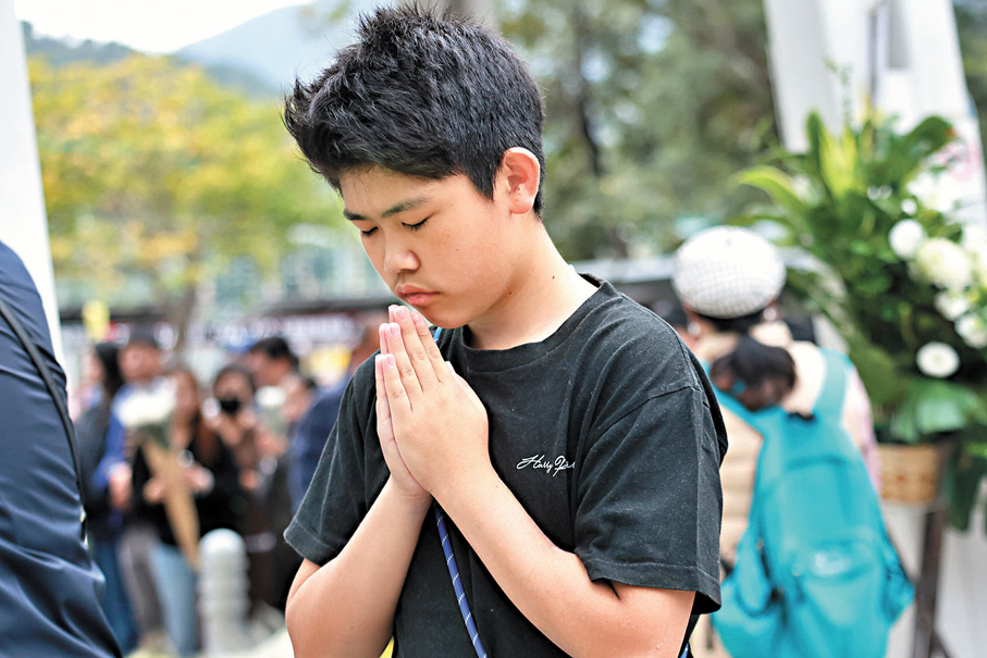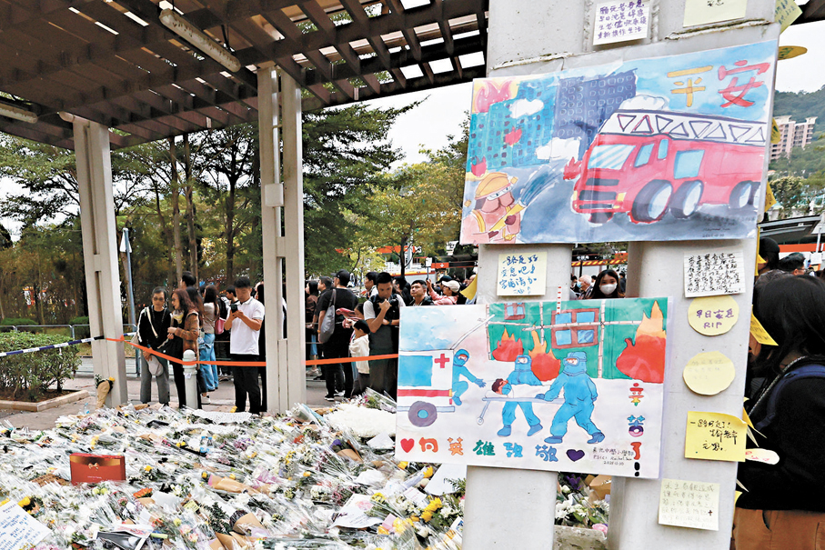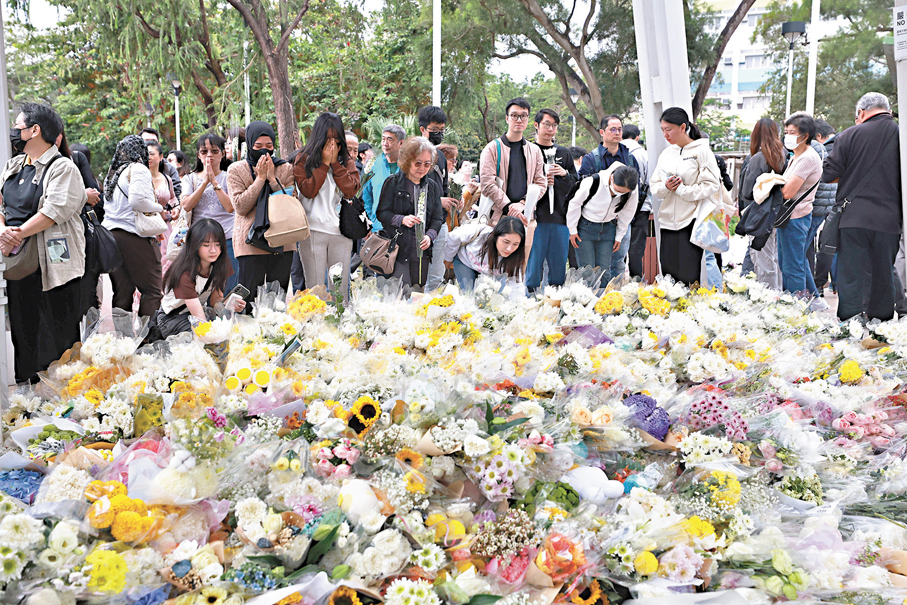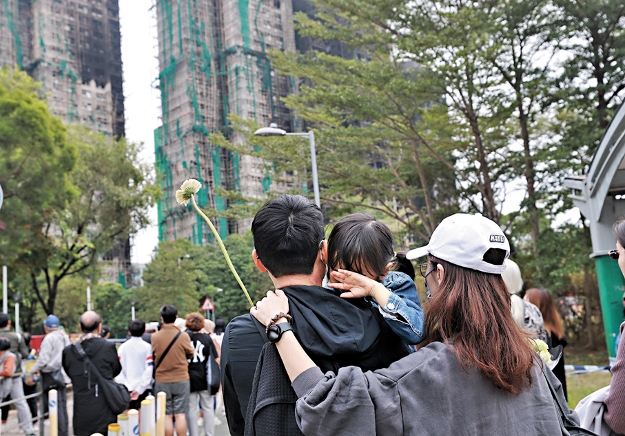 (香港文匯報 記者 崔瀅、李芷珊、盧慧穎、蕭景源、史柳藝、陸雅楠、李千尋)昏暗天氣下,十八區弔唁處昨日排起延綿人龍,其中毗鄰火災現場的廣福休憩處外獻花的人龍蜿蜒逾兩公里,輪候時間動輒一小時,苦等卻沒有怨言、沒有不耐煩,人們靜靜地、井然有序地輪候,有人垂頭憶起昔日濃濃的街坊情一夜間化灰燼;有人喃喃祈禱;有人縱然與傷亡者素未謀面,但在同一獅子山下休戚與共,遠道而來悼念,讓罹難者的家庭知道:你們從不孤單!因為一方有難,八方支援;也有內地市民專程來誌哀,「因為咱們都是一家人!」亦有外籍家庭傭工向在火災中喪生的同鄉表心意。無論什麼原因,大家最大的心願都是:「願逝者安息,生者振作,加油!往前看!」