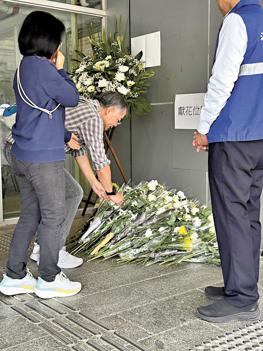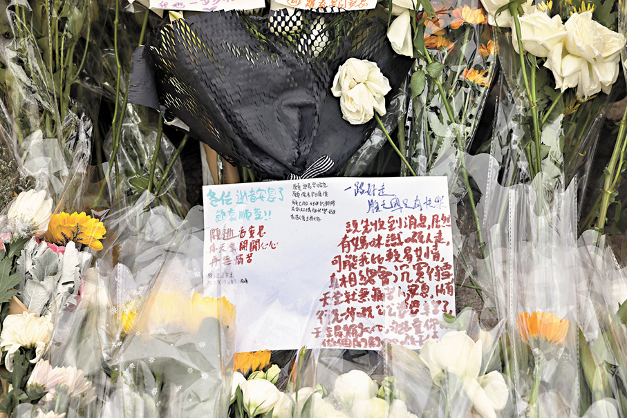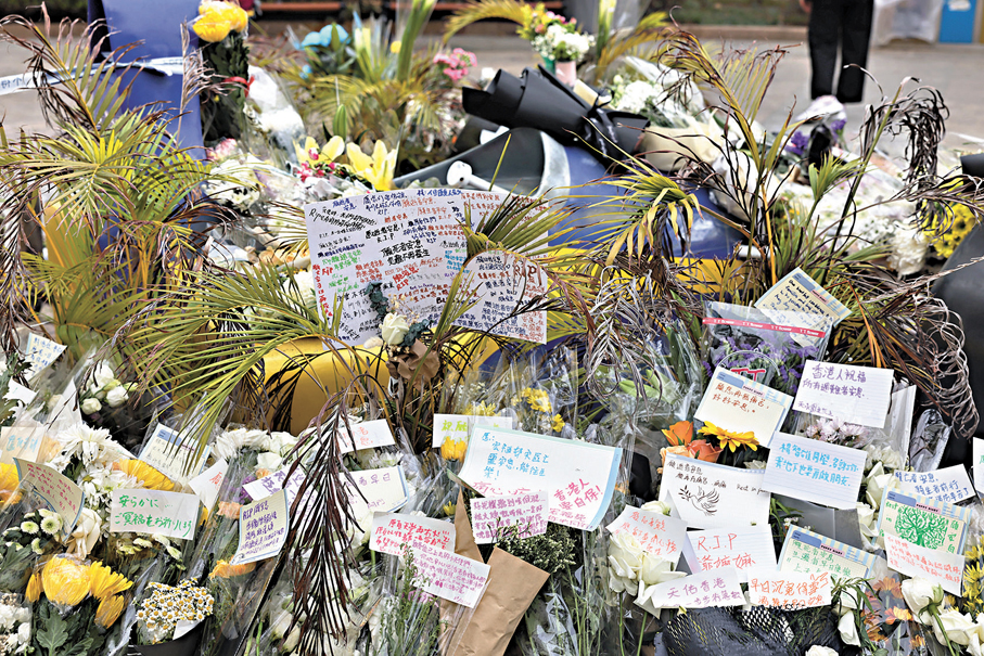 毗鄰火災現場的廣福休憩處由前晚開始,人龍不絕,昨日上午前來獻花悼念的市民絡繹不絕,中午後人龍一度延綿兩公里,目測有逾千人,人龍更伸延至東昌街社區會堂,花束堆積令廣福休憩處變成花海,一張張寫上真摯期許的心意卡在風中飄揚,將祝福送到遠方。
