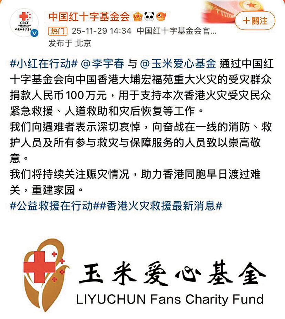 (香港文匯報 記者 達里、子棠)大埔宏福苑五級火災令全港籠罩在沉重氛圍之中,演藝界紛紛展現善心,慈善節目《善心滿東華》籌得1.18億港元,而截至目前,演藝界馳援香港的善款數字已逾2.15億港元。面對社會的傷痛,歌手楊千嬅與鄧紫棋不約而同希望透過演出,將音樂化為療癒心靈的集體陪伴,與香港市民一同渡過難關,給大家一起往前走的力量!