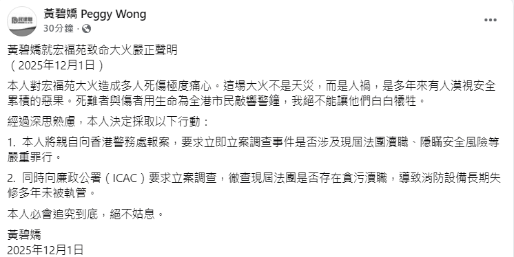 大公文匯全媒體報道,香港大埔宏福苑五級大火,造成重大人員傷亡和財產損失。今次屋苑大維修涉及逾3億元工程,由上一屆業主立案法團通過,曾任該屆法團顧問的民建聯大埔區議員黃碧嬌則捲入爭論。黃碧嬌今日(12月1日)發聲明表示,對宏福苑大火造成多人死傷極度痛心,稱「這場大火不是天災,而是人禍,是多年來有人漠視安全累積的惡果。死難者與傷者用生命為全港市民敲響警鐘,我絕不能讓他們白白犧牲。」她強調必會追究到底,絕不姑息。