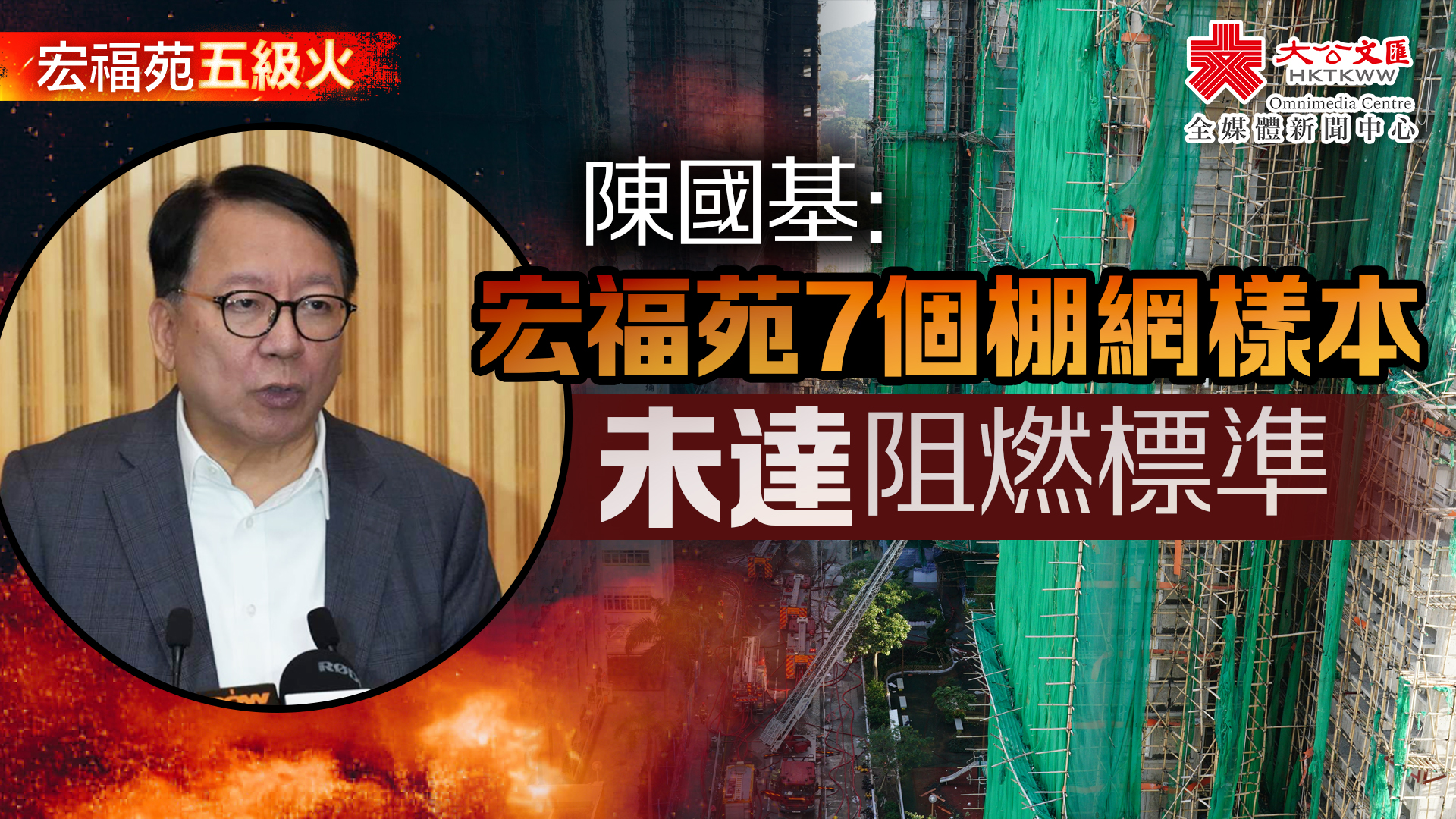 (大公文匯全媒體 記者 王俊傑)政務司司長陳國基聯同保安局局長鄧炳強、廉政專員胡英明和警務處刑事及保安處處長陳東,今日(12月1日)下午4時在政府總部西翼地下大堂,就大埔宏福苑五級火警跟進工作的最新進展會見傳媒。陳國基表示,警方於大埔宏福苑的宏泰閣、宏道閣、宏志閣、宏仁閣檢取20個棚網樣本,其中7個位處高、中、低層不同地方的樣本未達阻燃測試標準。