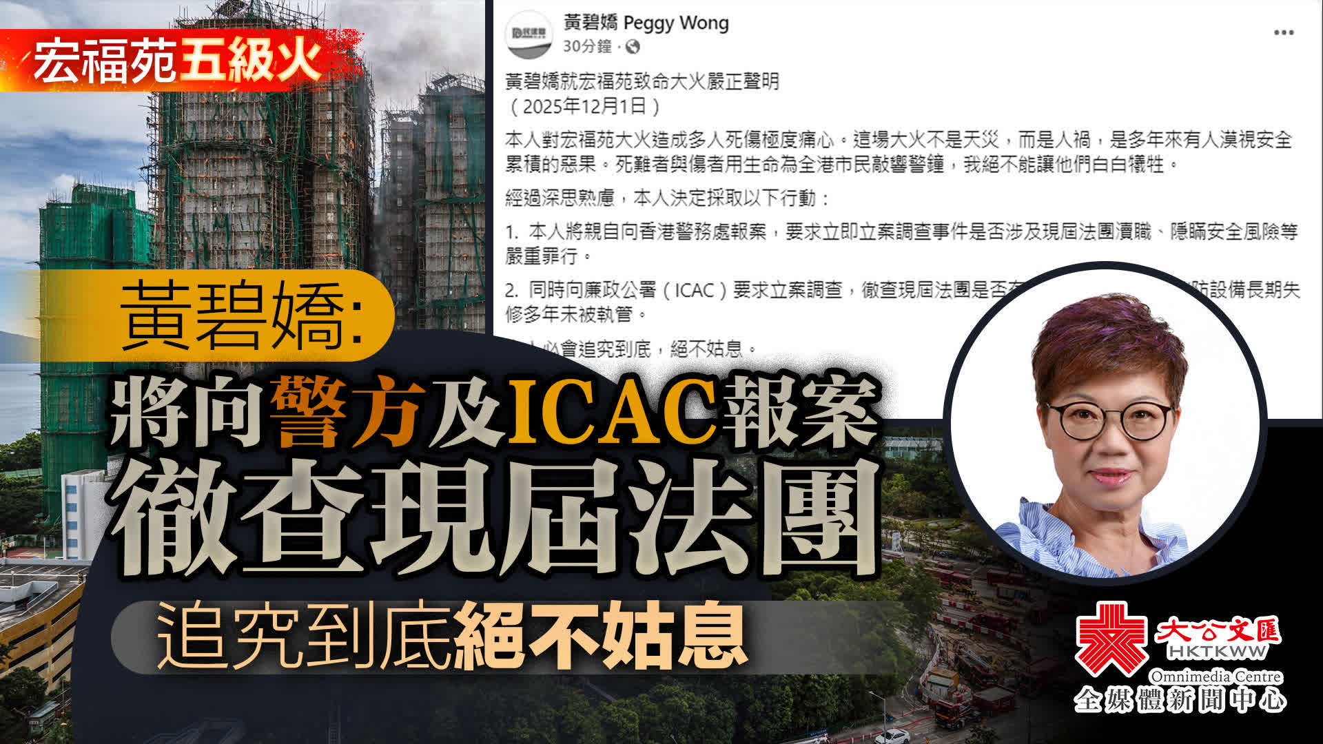 大公文匯全媒體報道,香港大埔宏福苑五級大火,造成重大人員傷亡和財產損失。民建聯大埔南區議員黃碧嬌指,將就宏福苑致命大火向警務處及廉政公署報案,要求立案調查事件是否涉及現屆法團瀆職。宏福苑業主立案法團今日(12月1日)發表聲明,表示法團管理委員會全體委員高度重視今次事件,將全力配合警方及廉政公署的任何調查工作,支持依法追查真相,希望能早日釐清責任,為居民討回公道,亦還事件公正的交代。