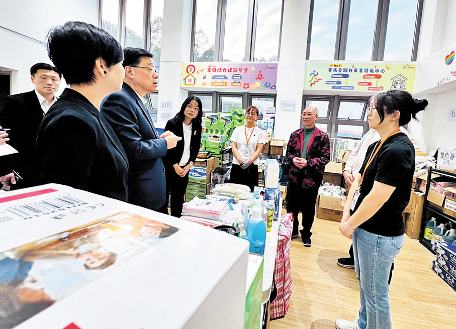 李家超亦視察由活動室改設的臨時物資中心,當中存放各界捐贈的生活用品。他親切讚揚負責營運的社福機構職員、社工,以及主動協助新遷入災民的「雙魚薈」鄰舍居民,他對社福機構各人員和「雙魚薈」鄰舍居民挺身而出、無私付出深受感動,體現香港社會守望相助的團結精神。
