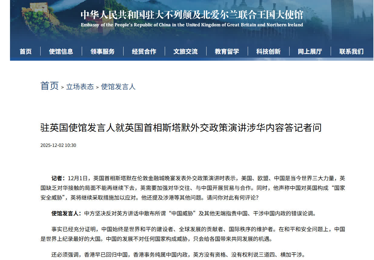 大公文匯網報道,12月2日,中國駐英國使館發言人就英國首相斯塔默外交政策演講涉華內容答記者問。記者:12月1日,英國首相斯塔默在倫敦金融城晚宴發表外交政策演講時表示,美國、歐盟、中國是當今世界三大力量,英國缺乏對華接觸的局面不能再繼續下去,英需要加強對華交往、與中國開展貿易與合作。同時,他聲稱中國對英國構成「國家安全威脅」,英將繼續採取措施加以應對。他還提及涉港等其他問題。請問你對此有何評論?
