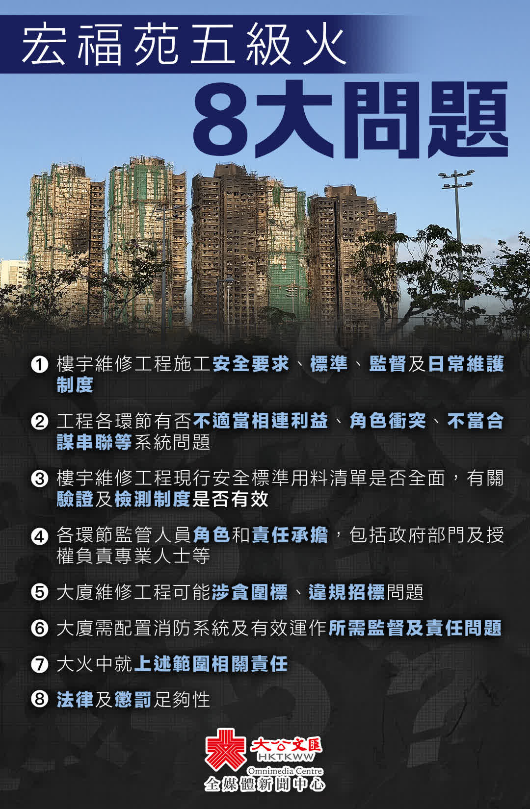 這些問題包括:第一,樓宇維修工程的施工安全要求、標準、監督及日常維護制度;第二,有關工程各環節有否不適當的相連利益、角色衝突、不當合謀串聯等系統問題;第三,針對樓宇維修工程,現行安全標準用料清單是否全面,有關驗證及檢測制度是否有效;第四,各環節監管人員的角色和責任承擔,包括政府部門及授權負責的專業人士等;第五,大廈維修工程可能涉貪圍標、違規招標的問題;第六,大廈需配置的消防系統及有效運作所需的監督及責任問題;第七,大火中就上述範圍的相關責任;第八,法律及懲罰的足夠性。