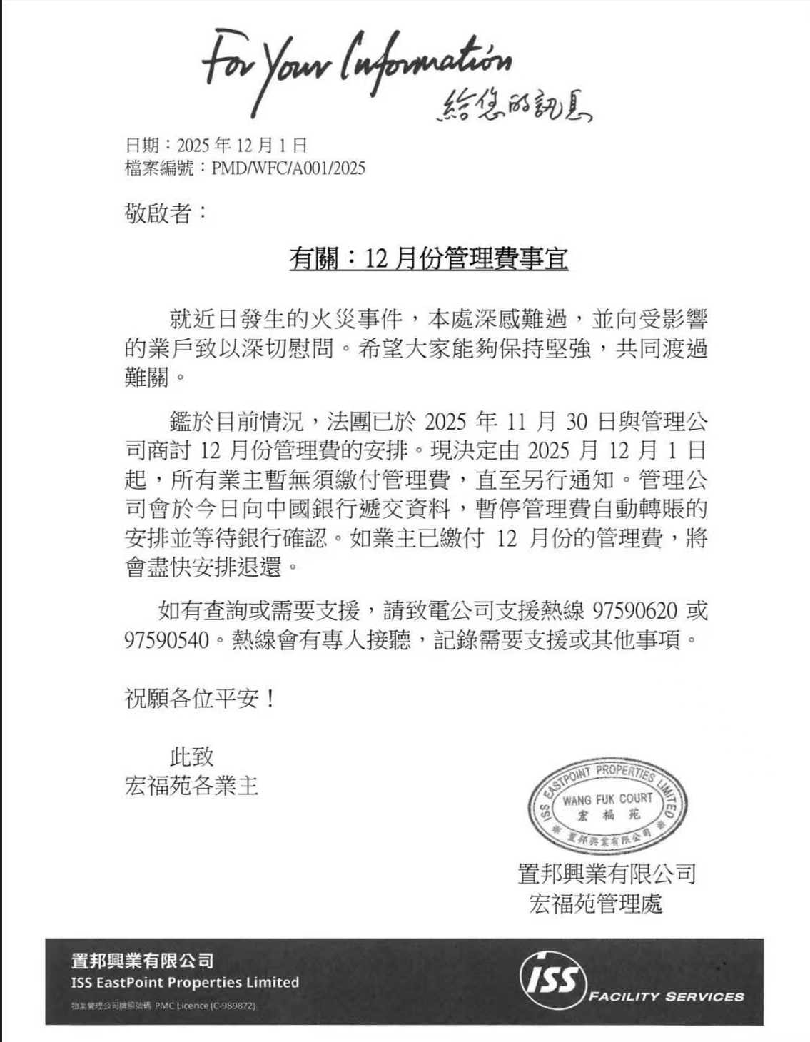 12月1日,置邦興業有限公司與宏福苑管理處聯合宣布,受火災影響,12月1日起,所有業主將豁免繳付管理費。管理公司將向中國銀行遞交資料,暫停管理費自動轉賬的安排,並為已繳納管理費的業主退還款項。