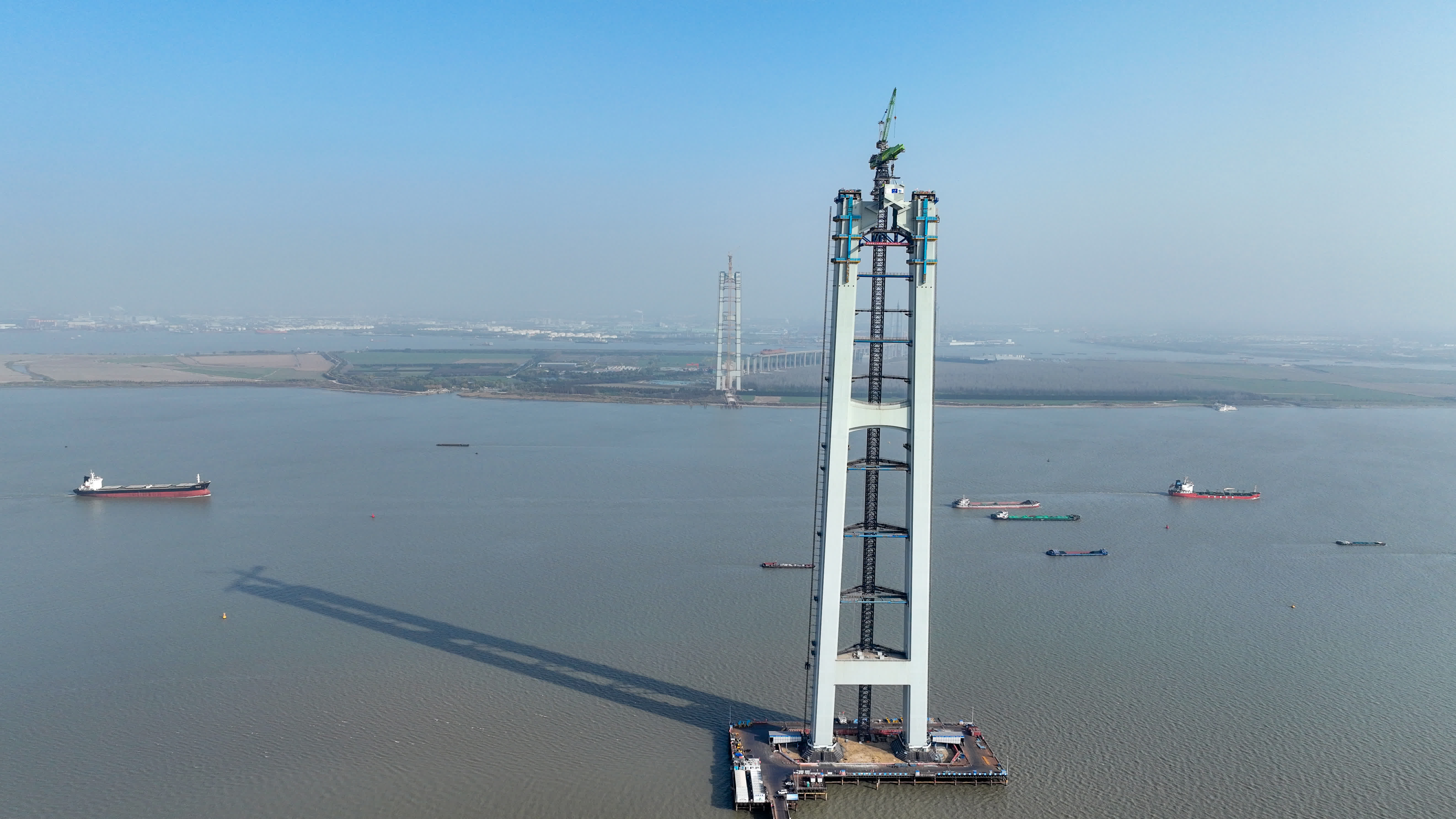 12月1日,隨着南航道橋南主塔上橫樑完成「雲端合龍」,江蘇省張靖皋長江大橋南航道橋主塔全部實現封頂。至此,大橋南、北航道橋四座主塔主體結構全面完工,全橋建設正式由下部結構轉入上部結構施工新階段。