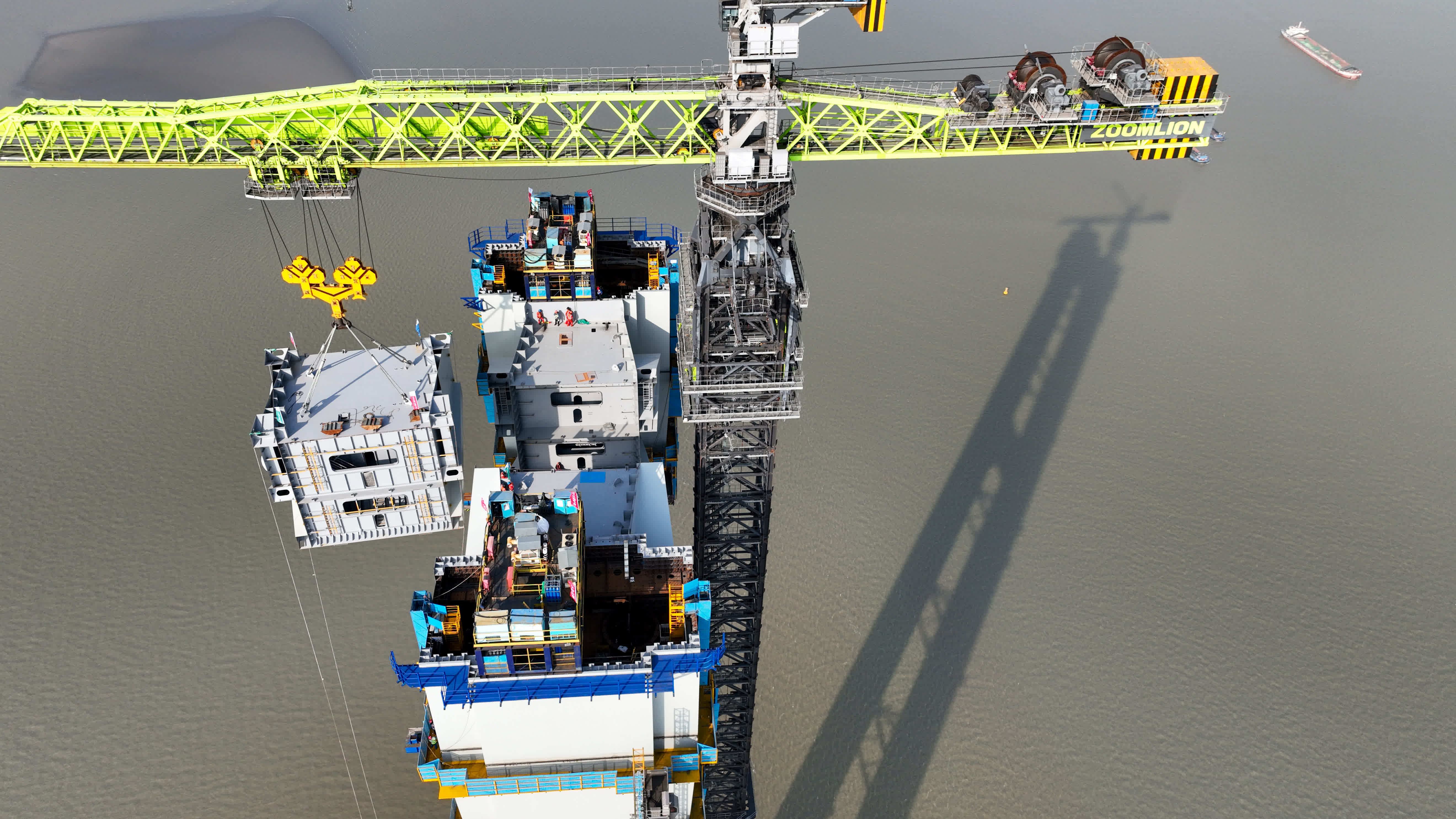 張靖皋長江大橋由江蘇省交通工程建設局建設、中交二航局參建,大橋南航道橋兩座主塔均設有三道橫樑,本次合龍的上橫樑分為三個節段進行吊裝,最重節段達262噸,施工採用全球首台萬噸米級塔吊進行安裝,並運用全斷面焊接連接工藝。在合龍段安裝前,項目團隊依託三維數字化技術進行全過程模擬,成功將焊縫寬度精確控制在6至10毫米之間,實現了無應力狀態下的高精度合龍。